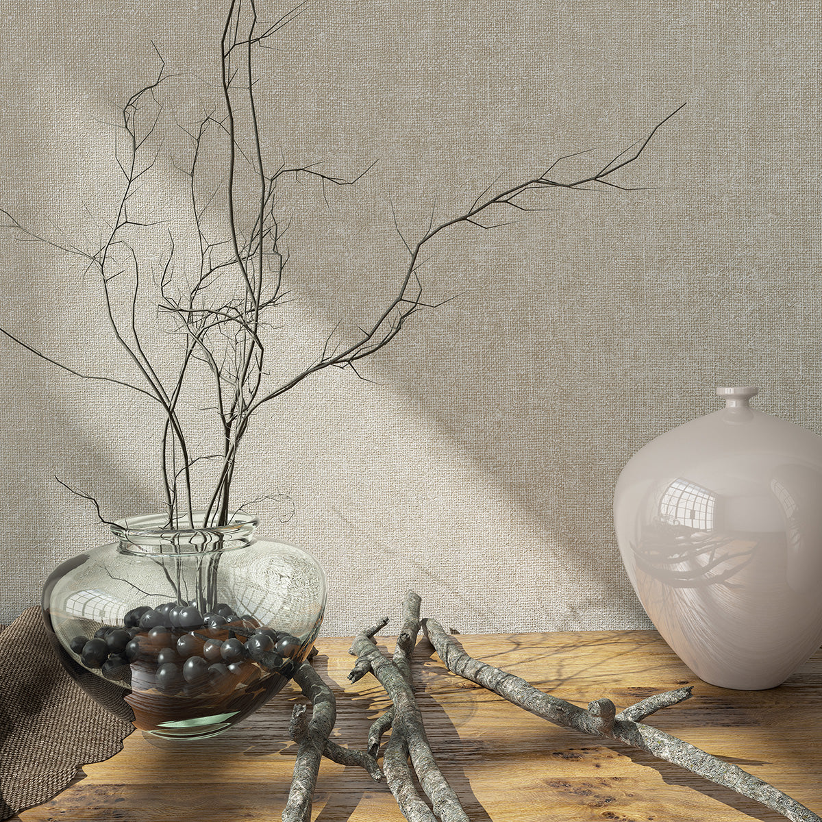 Стилен едноцветен тапет с топла структура на текстилна материя. Визията и усещането за облечена в плат стена създава чувство за уют и комфорт и носи елегантността на естествените материи. Неутралната цветова гама дава възможност за лесно съчетаване с мебели и аксесоари, както и за комбиниране с тапети с мотиви от колекцията.
