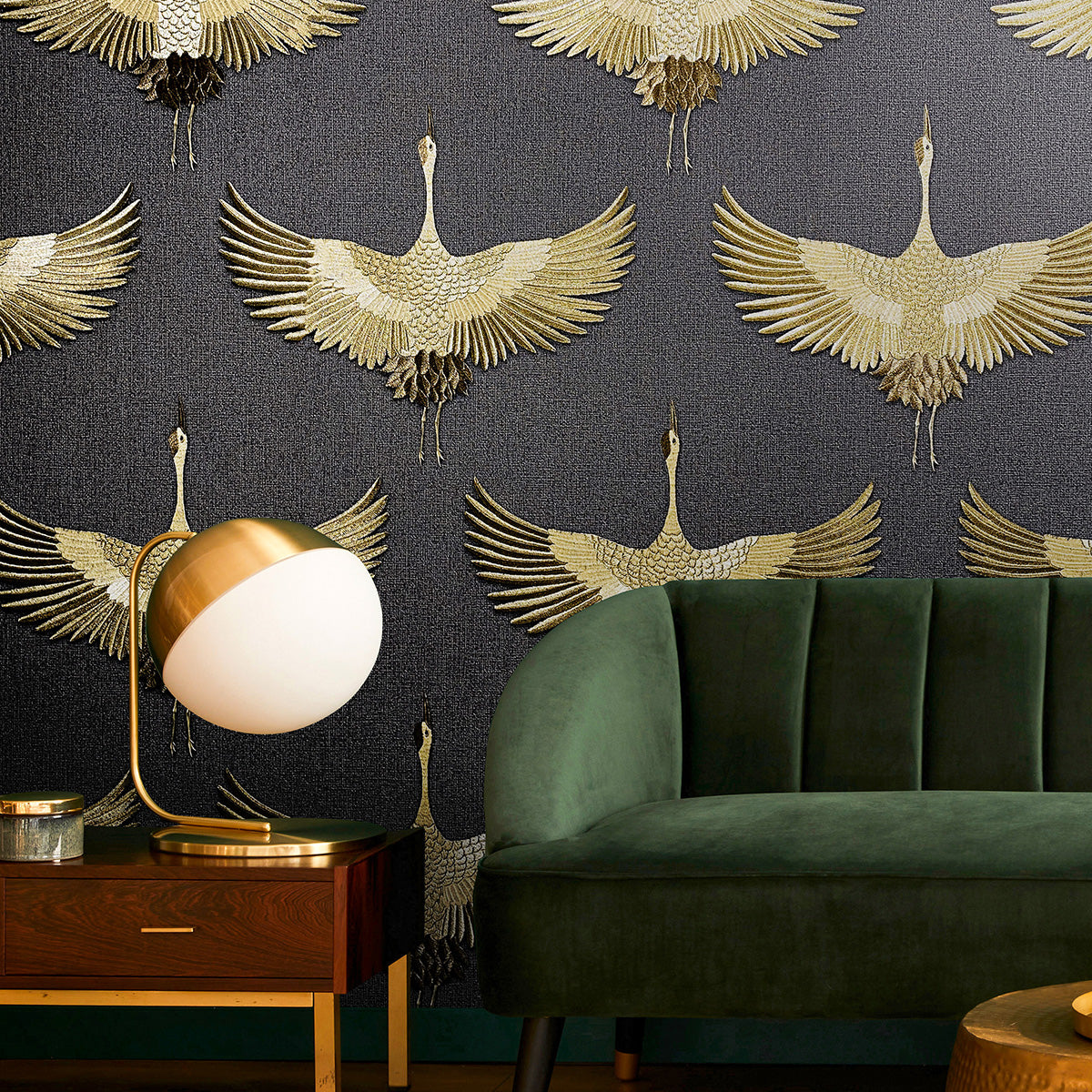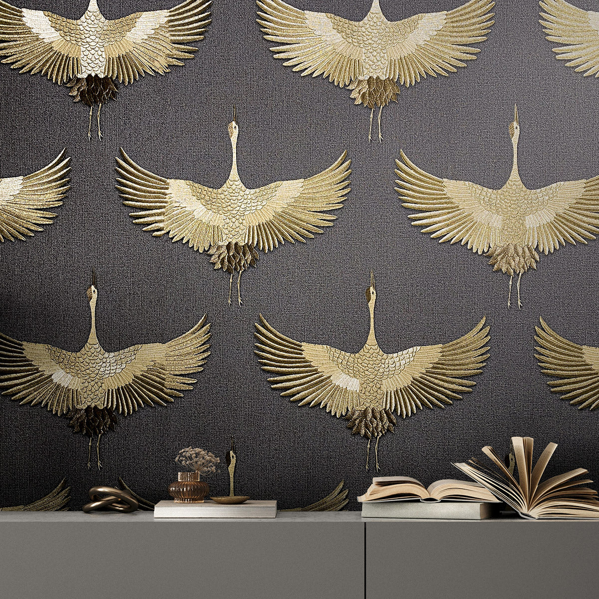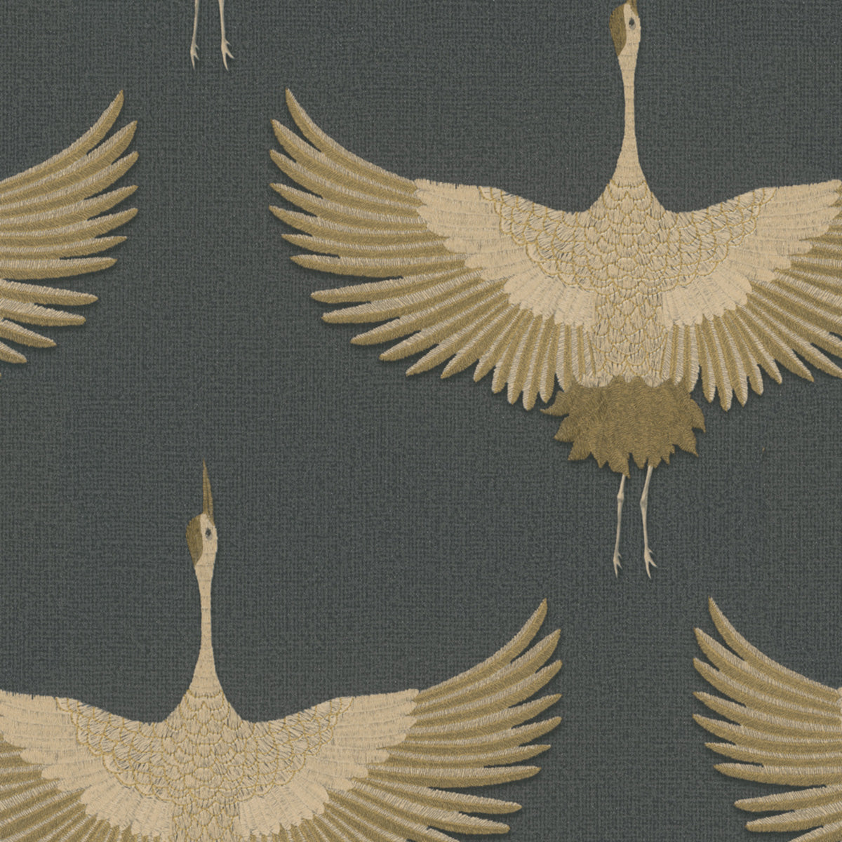 Тапет с дизайн, издържан в стилистиката на актуалния стил джапанди – комбинация от скандинавския уют на севера и изчистените линии на японското изкуство. Мотивът жерави в полет – в Япония символ на дълъг живот - е сякаш избродиран върху текстилния фон. Този фон се предлага в колекцията и като едноцветен тапет, подходящ за комбиниране с дизайна.