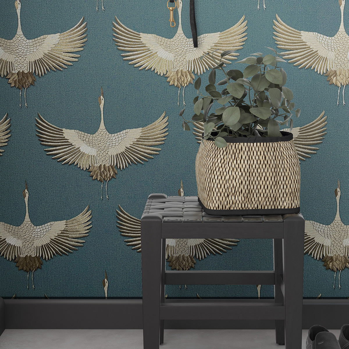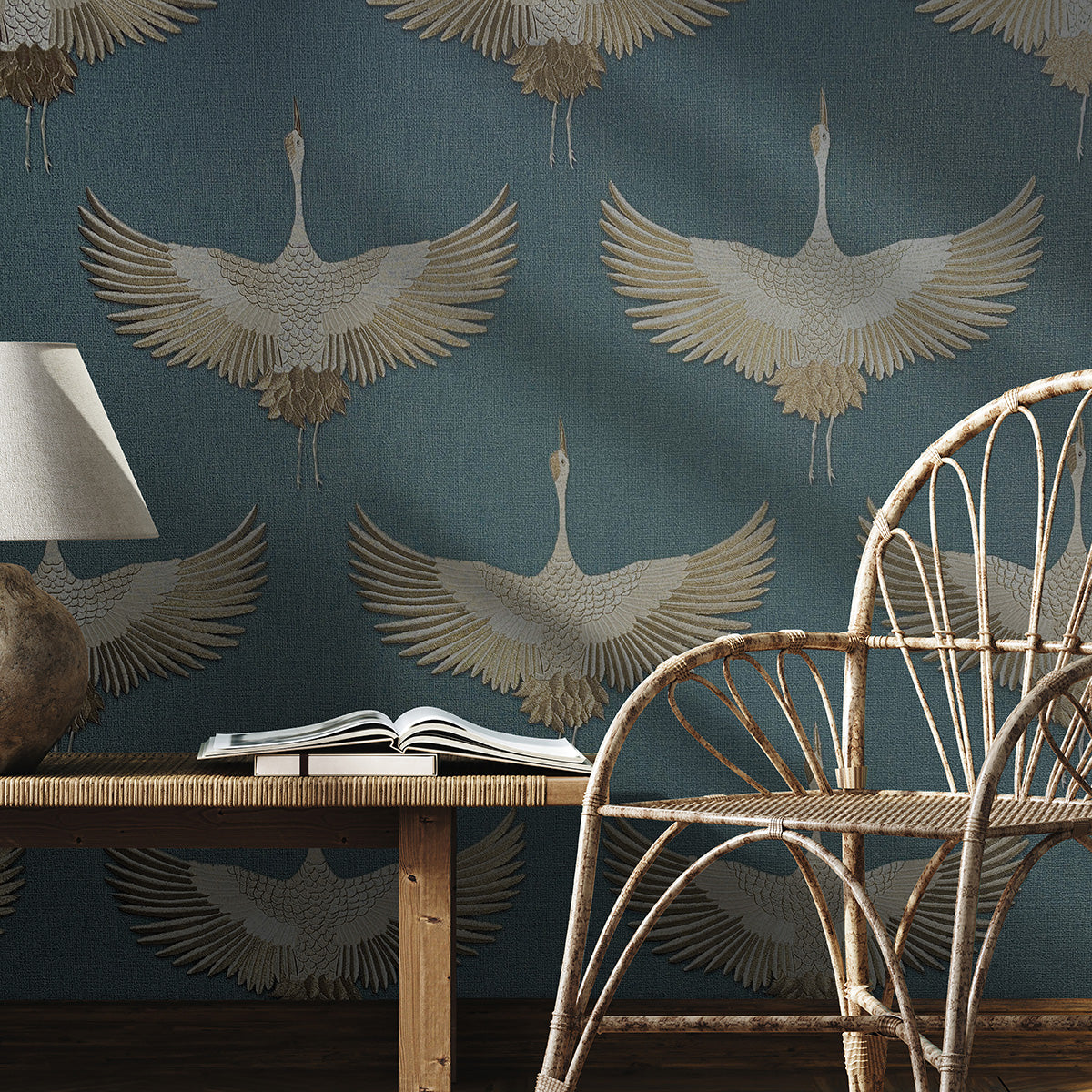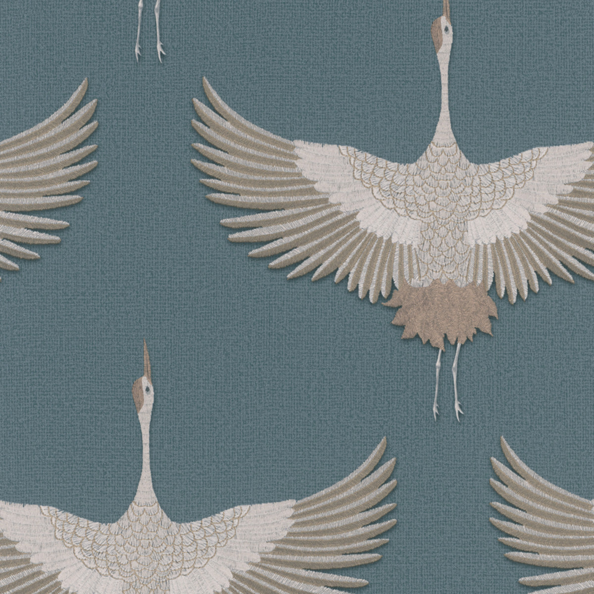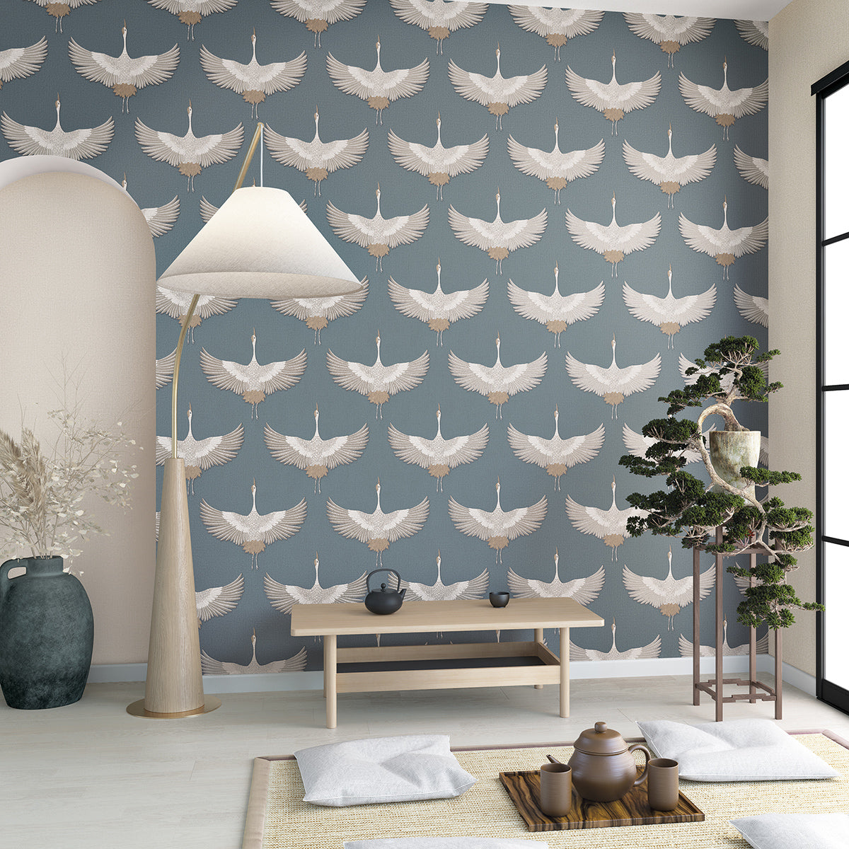 Тапет с дизайн, издържан в стилистиката на актуалния стил джапанди – комбинация от скандинавския уют на севера и изчистените линии на японското изкуство. Мотивът жерави в полет – в Япония символ на дълъг живот - е сякаш избродиран върху текстилния фон. Този фон се предлага в колекцията и като едноцветен тапет, подходящ за комбиниране с дизайна.
