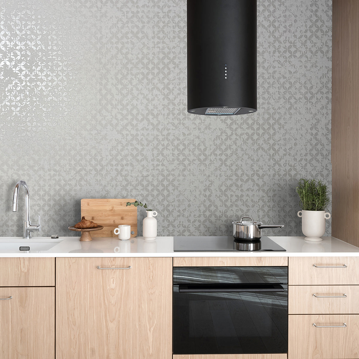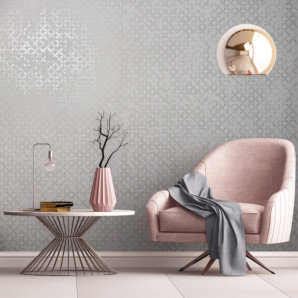 Елегантен тапет с „диамантен“ дизайн, създаден от частично застъпващи се кръгове с гланцова повърхност, върху основа със структура на текстил. На някои места „боята“ вече изглежда леко се отлепва, създавайки очарователна патина, напомняща за изветрелите стени в стари имения.