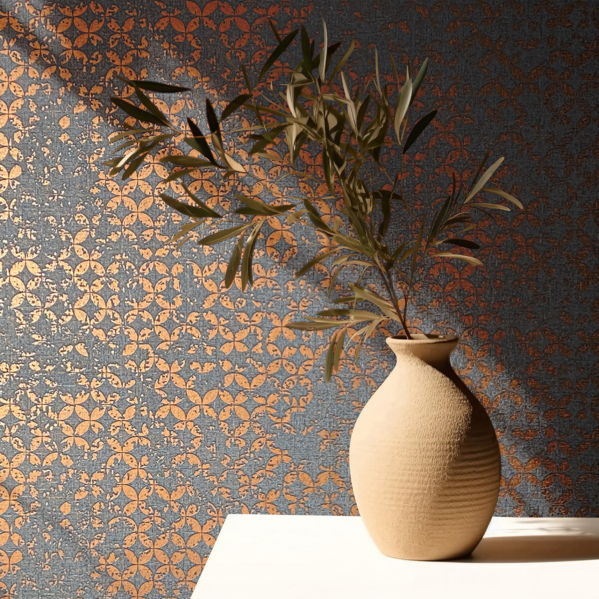 Елегантен тапет с „диамантен“ дизайн, създаден от частично застъпващи се кръгове с гланцова повърхност, върху основа със структура на текстил. На някои места „боята“ вече изглежда леко се отлепва, създавайки очарователна патина, напомняща за изветрелите стени в стари имения.