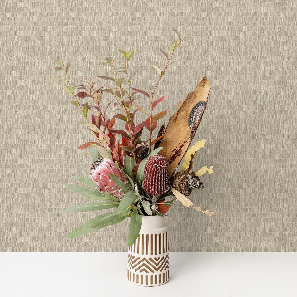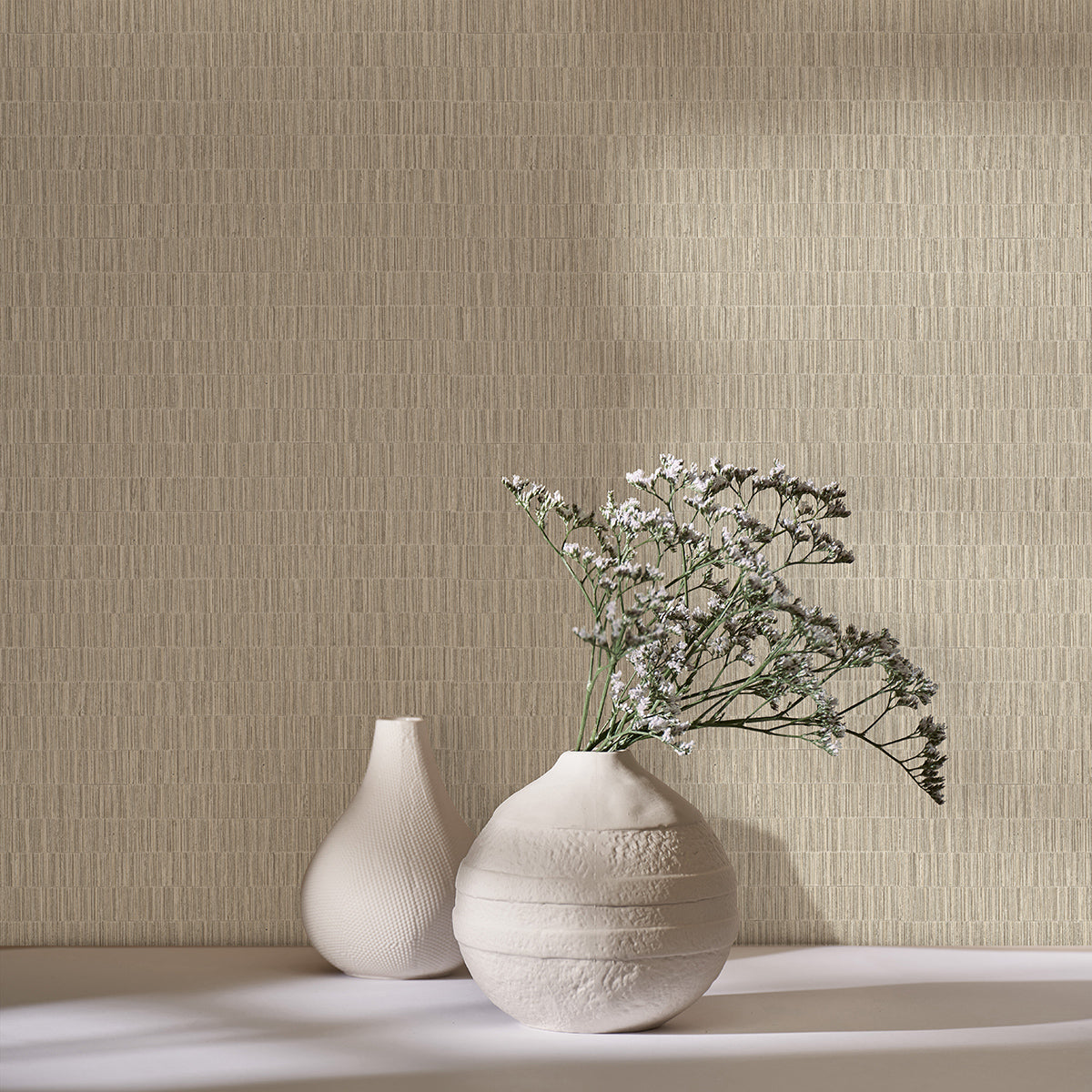 Топли дървесни тонове и структура, напомняща сламена рогозка – характеристики, които правят този тапет идеален избор за създаване на топла и естествена атмосфера.