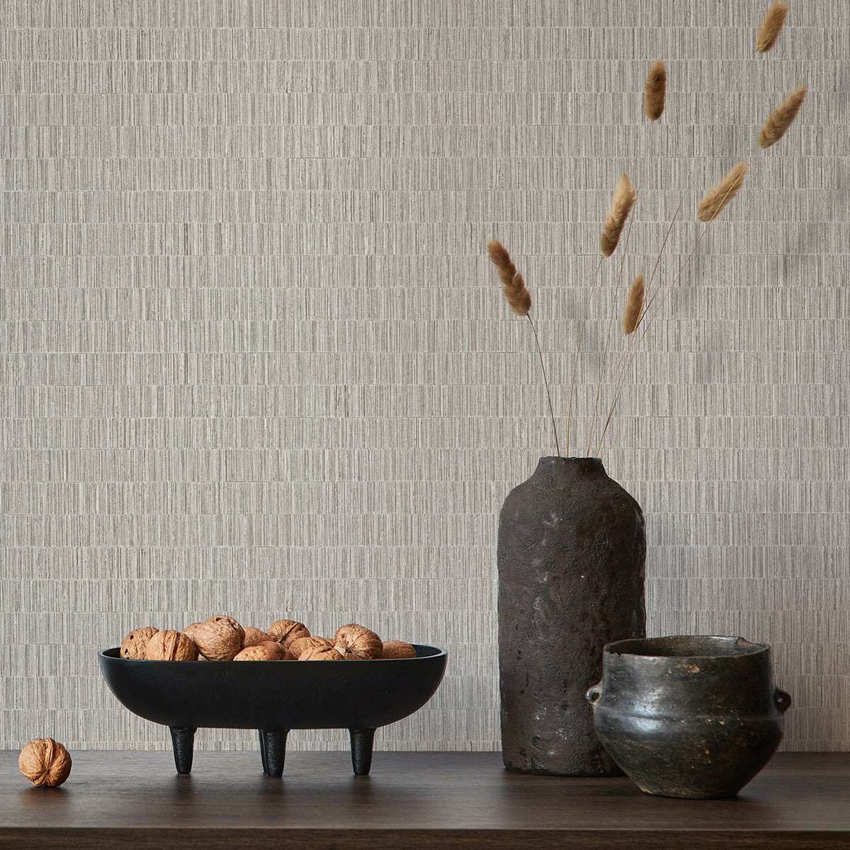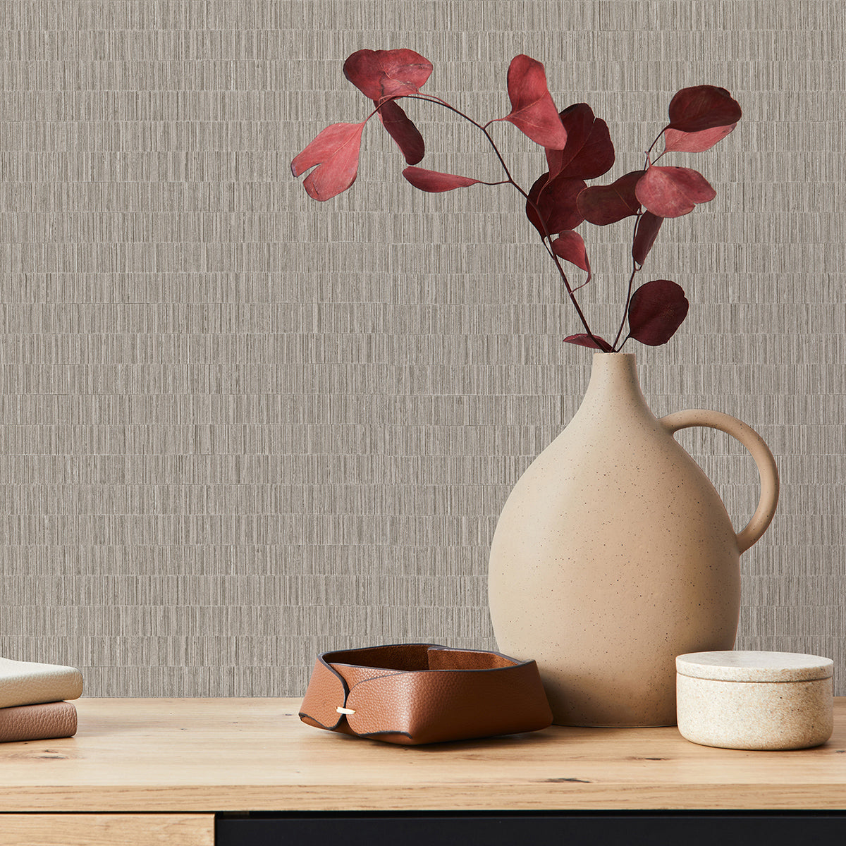 Топли дървесни тонове и структура, напомняща сламена рогозка – характеристики, които правят този тапет идеален избор за създаване на топла и естествена атмосфера.
