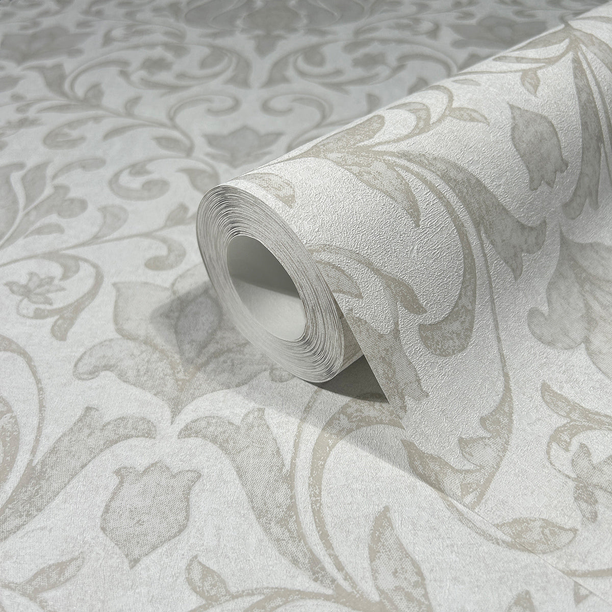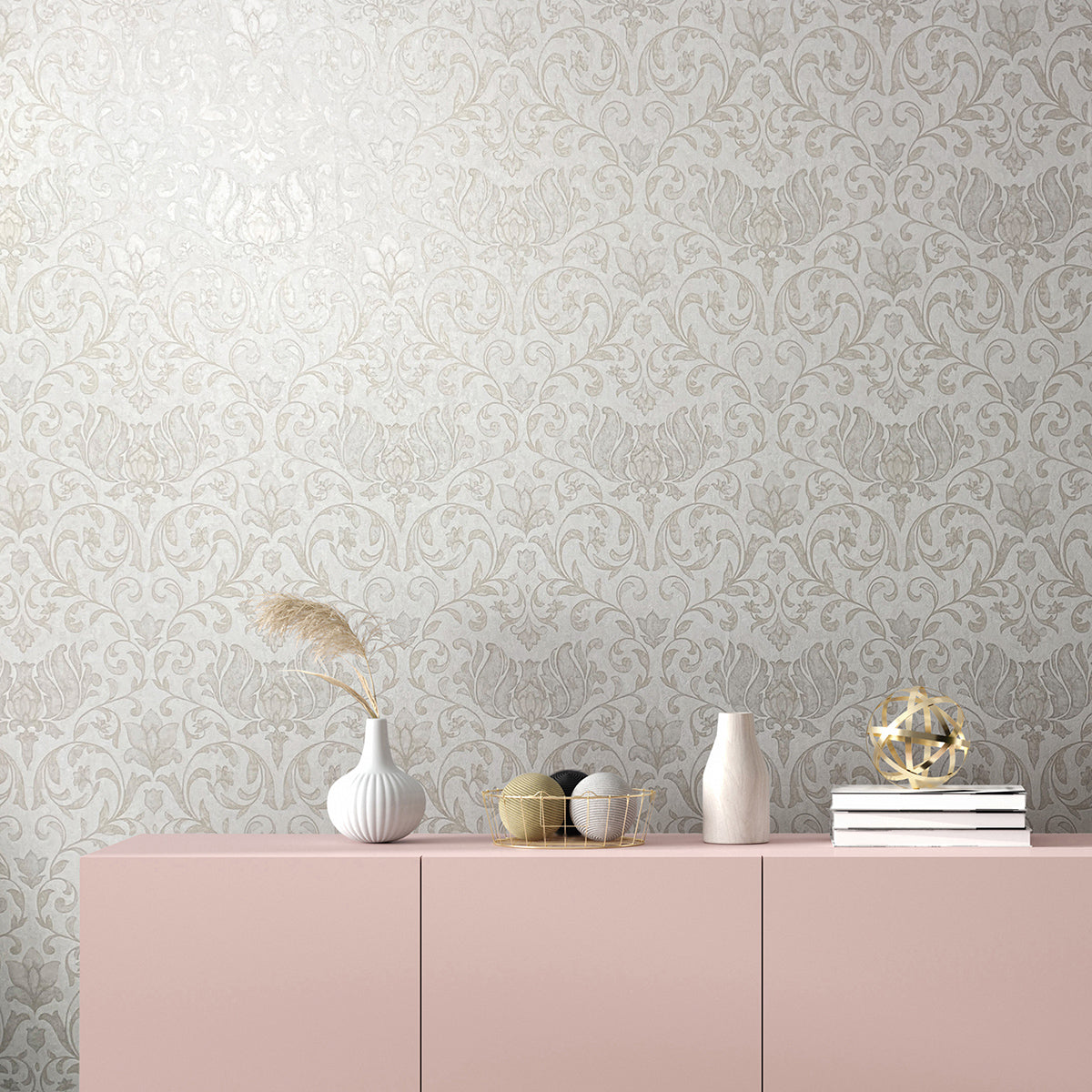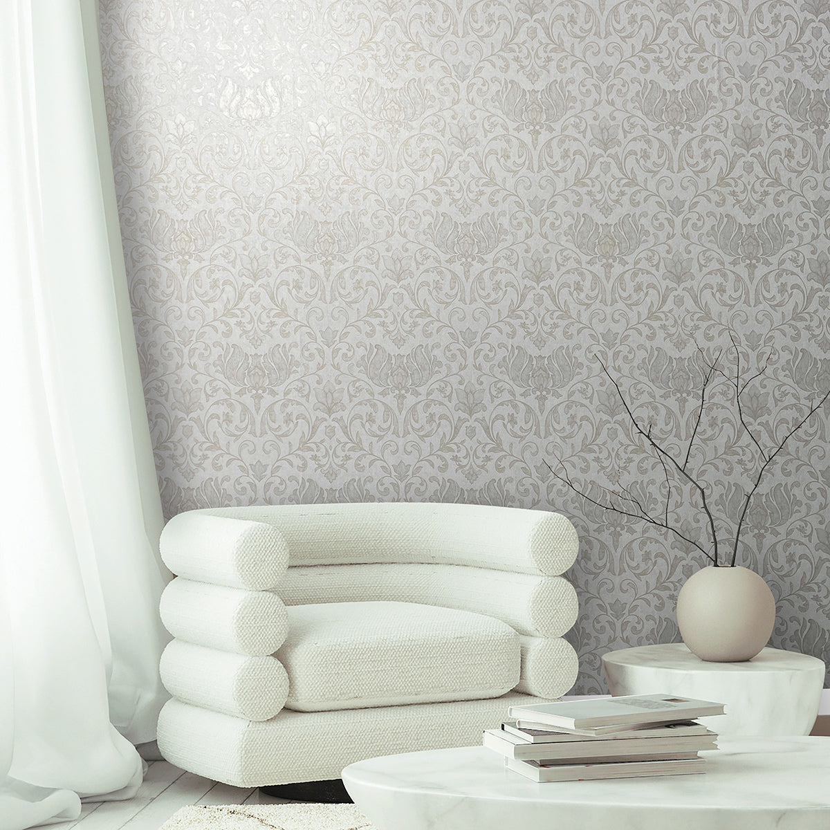 Мотив на дамаска, съставена от нежни листа и цветя. Този дизайн съчетава класическа елегантност с романтична, игрива нотка. Листата и цветята изглеждат изкусно аранжирани, почти като на стар гоблен, и придават на стаята чувствена, носталгична атмосфера, която напомня за отминали времена, пълни с блясък и романтика.