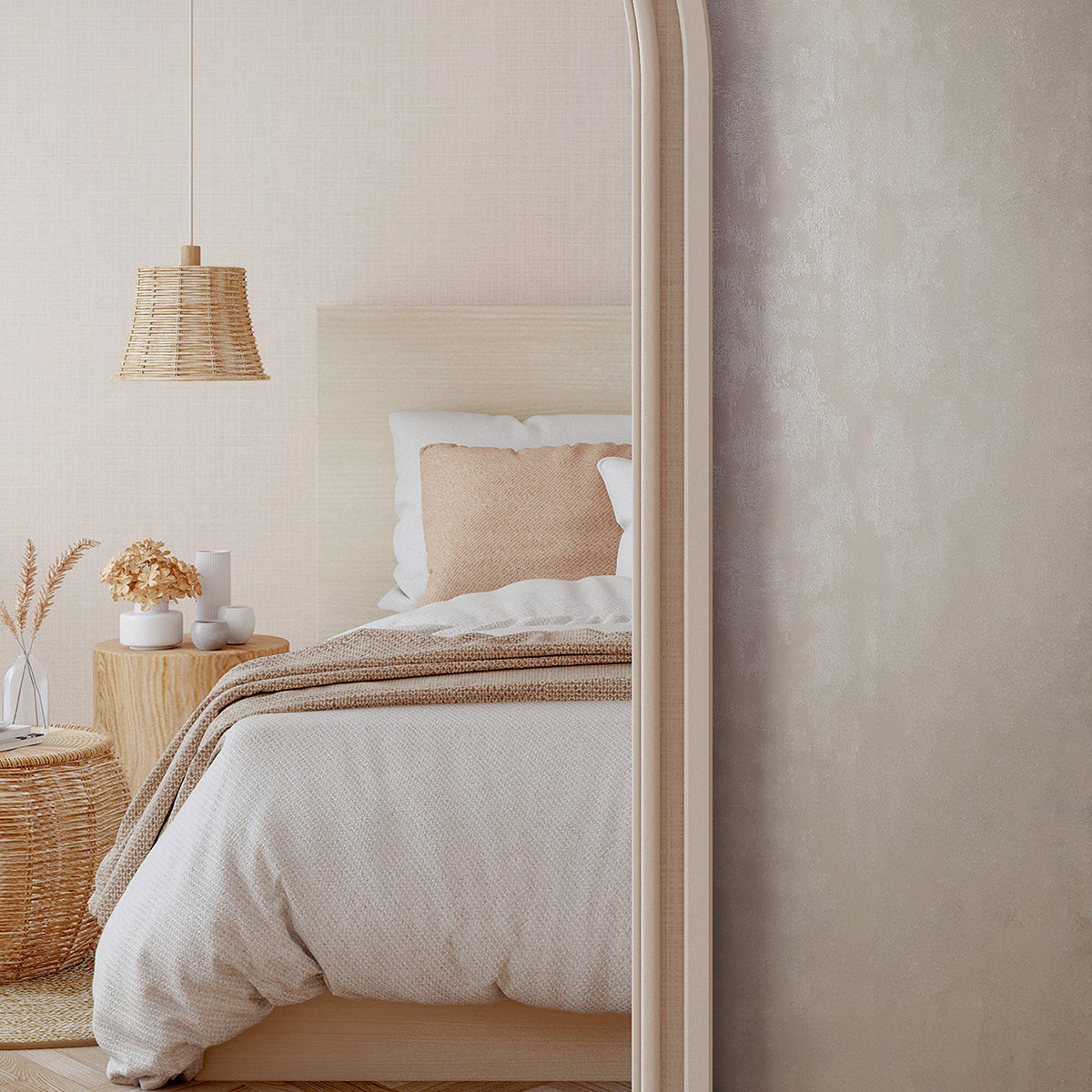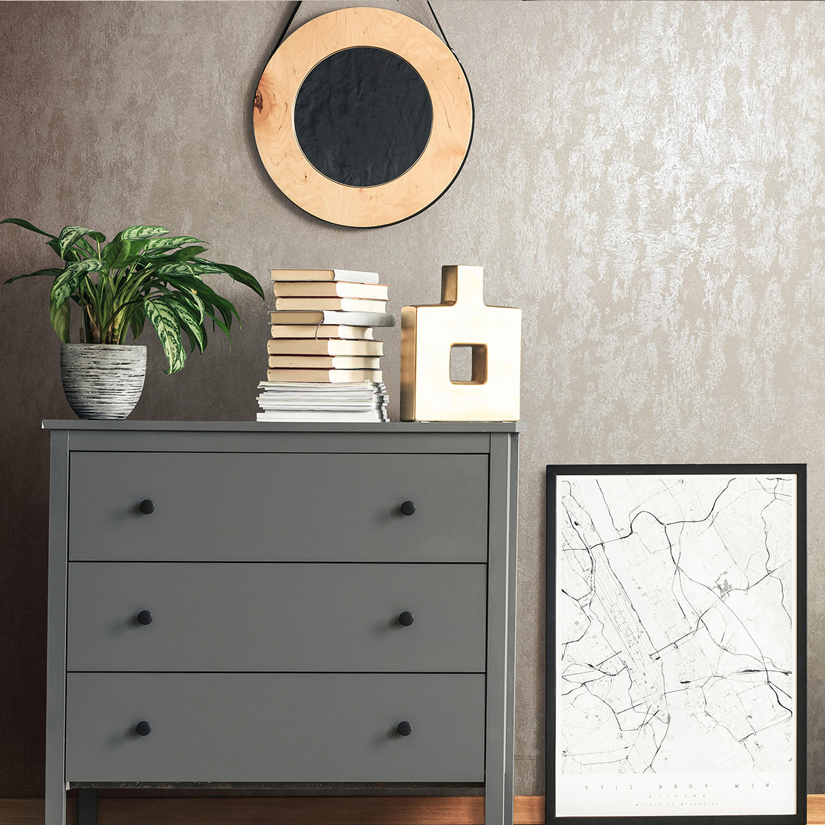 Едноцветен тапет със структура на мазилка. Елегантен цвят и фина текстура, която разпределя деликатният металически блясък в съответствие с ъгъла, под който пада светлината в помещението.