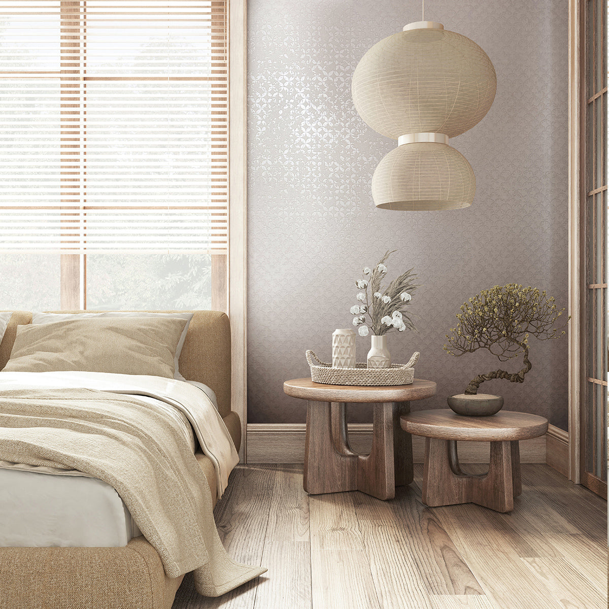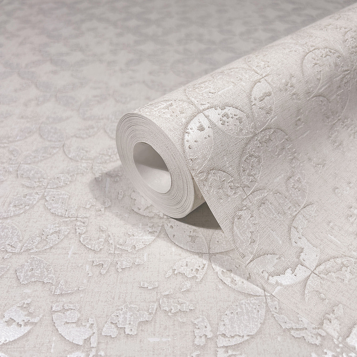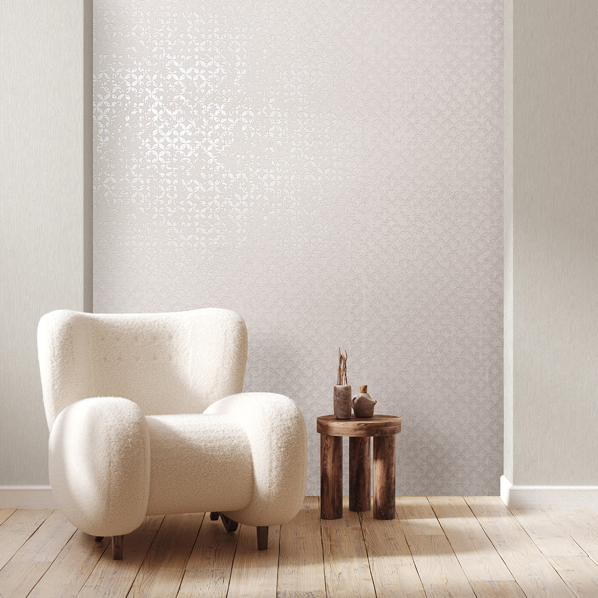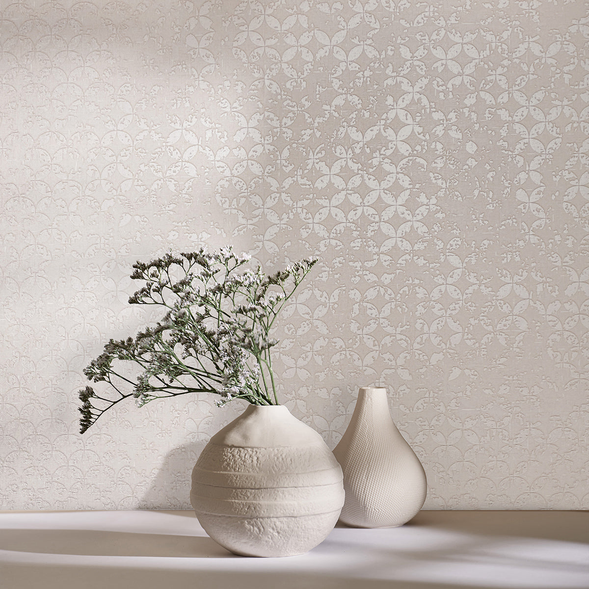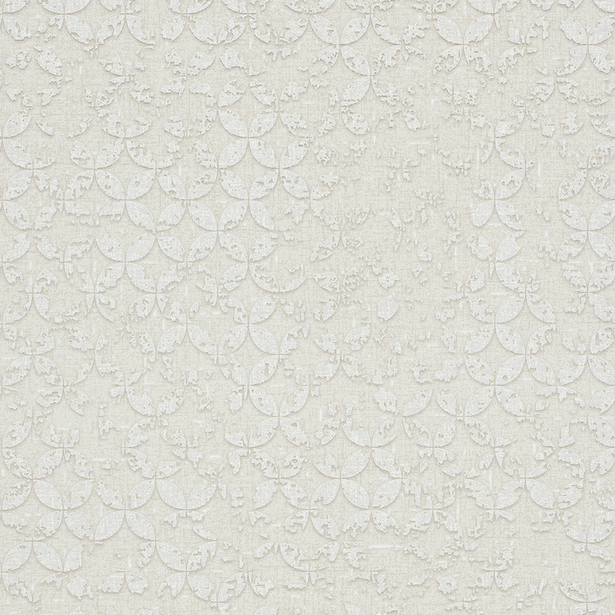 Елегантен тапет с „диамантен“ дизайн, създаден от частично застъпващи се кръгове с гланцова повърхност, върху основа със структура на текстил. На някои места „боята“ вече изглежда леко се отлепва, създавайки очарователна патина, напомняща за изветрелите стени в стари имения.