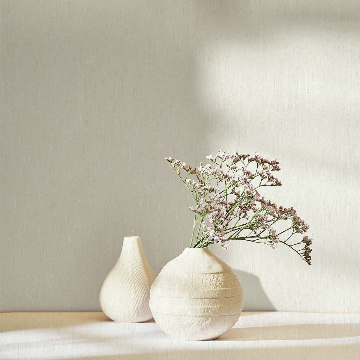Едноцветен флис тапет в нежен нюанс, подходящ за комбиниране с тапетите с мотиви от колекцията. Повърхността е гладка с принт, който визуално интерпретира текстил от естествена материя.