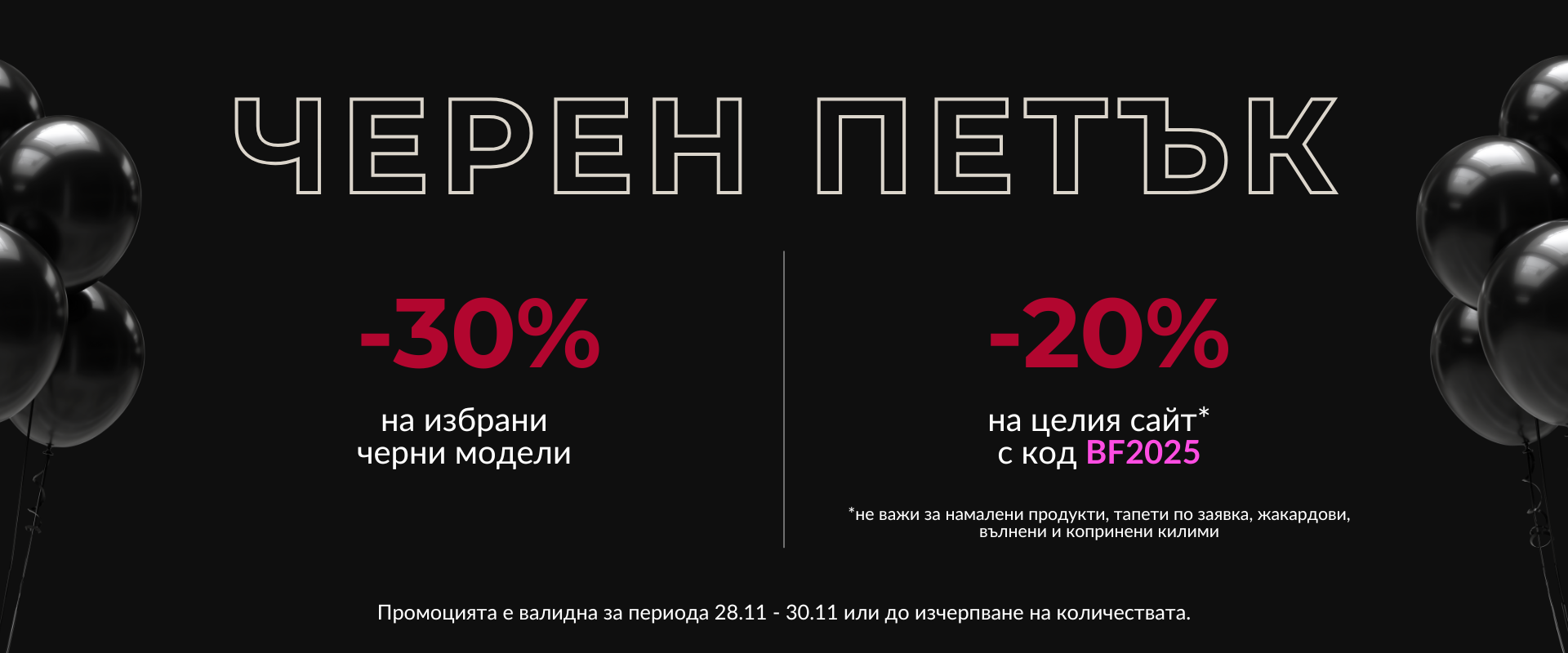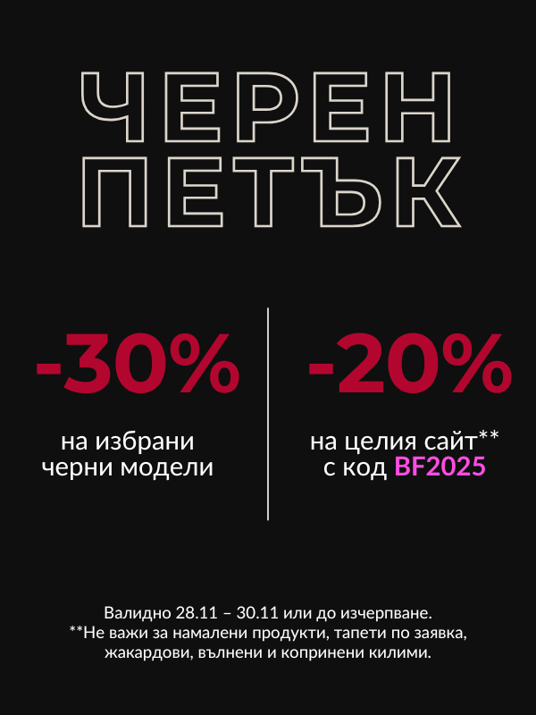 –20% на целия сайт с код BF2025, с изключение на намалени продукти, тапети по заявка, жакардови килими и луксозни вълнени и копринени килими.