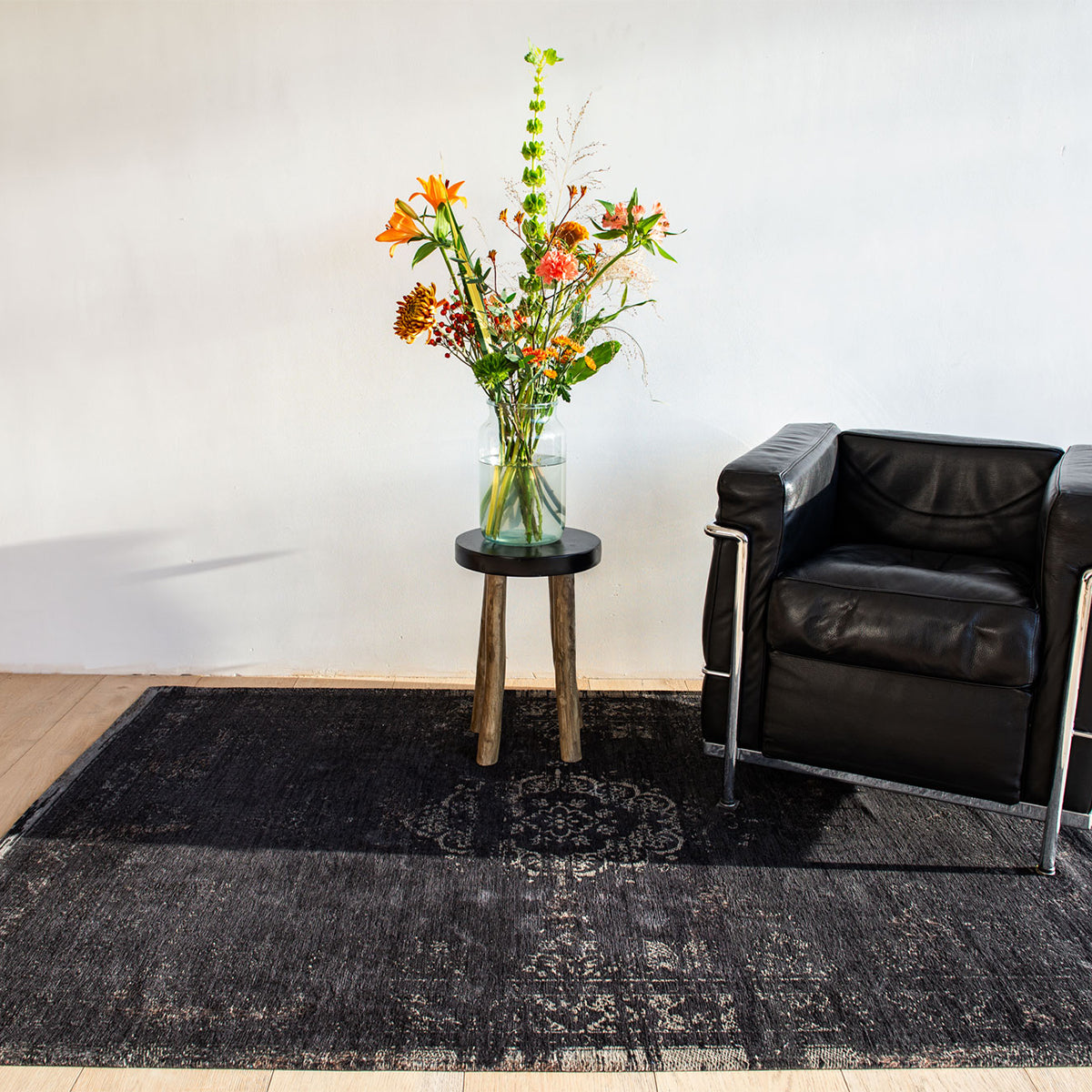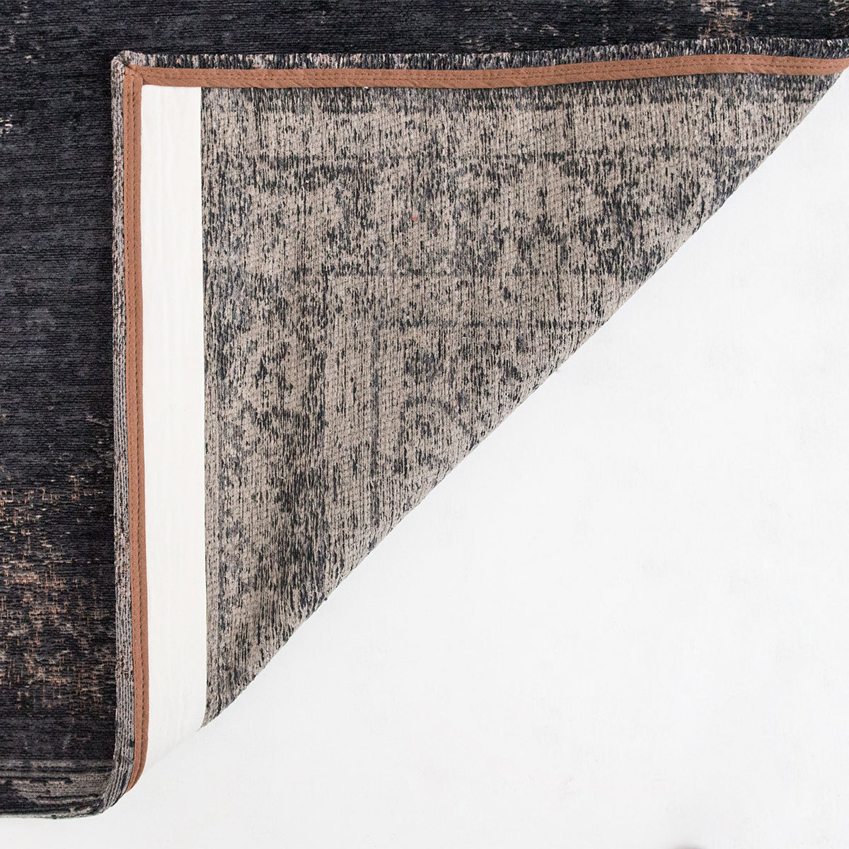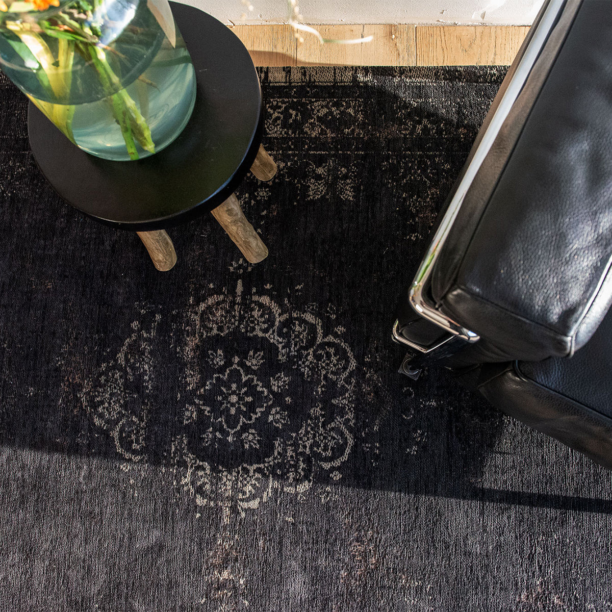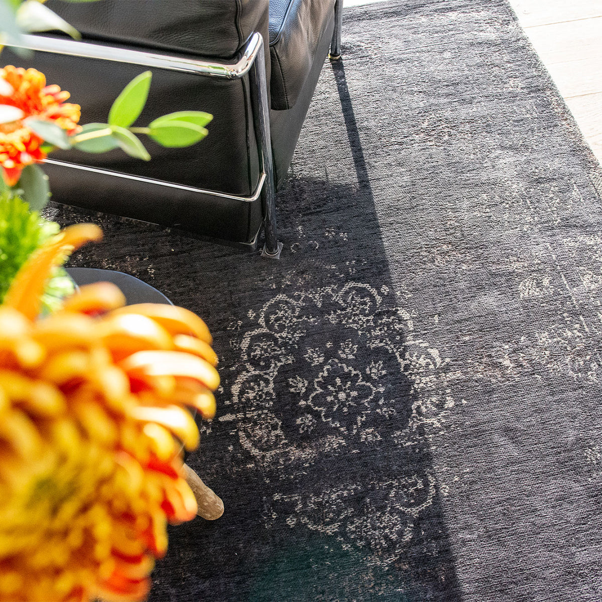 Жакардов Килим Медальон Графитено Черен - класически дизайн с централна фигура медальон и стилен винтидж завършек. Вплитането на зони и изтриването на участъци от мотиви в този дизайн позволява да включите част от историята във вашия дом. А наситеното черно елегантно разкрива детайлите на дизайна.