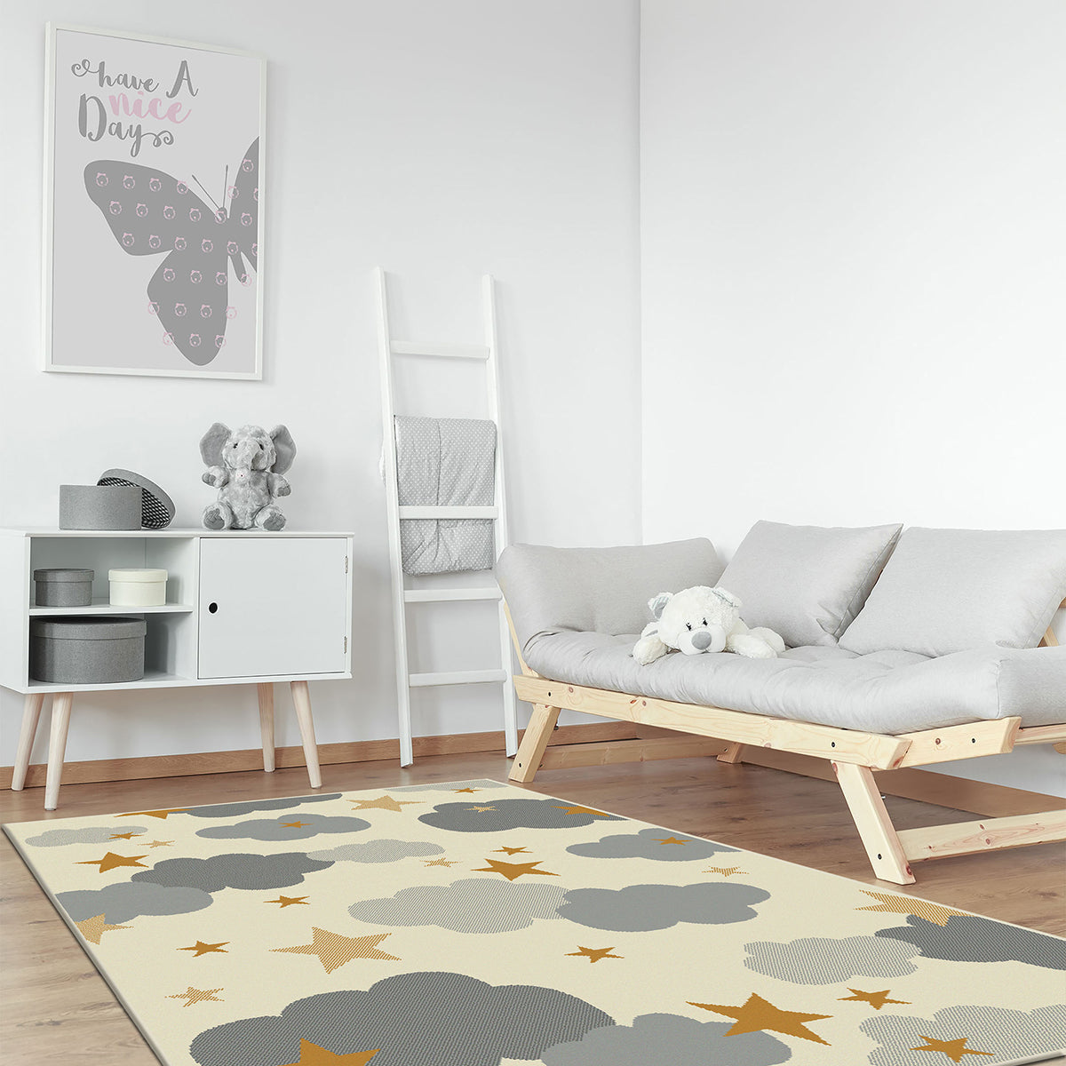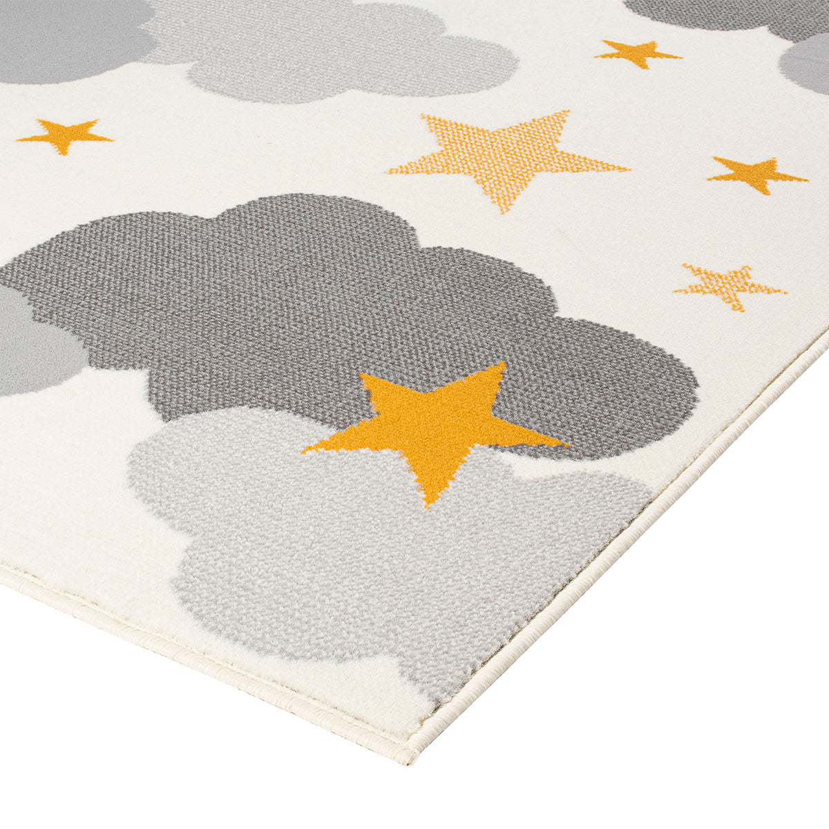 Детски килим с любим звезден дизайн, за спокойна и успокояваща атмосфера в стаята на бебето или малкото дете. Златистото жълто на звездичките и мекото сиво на облаците контрастира на кремавия фон. Влакното е с ниска височина, за лесна поддръжка и почистване.