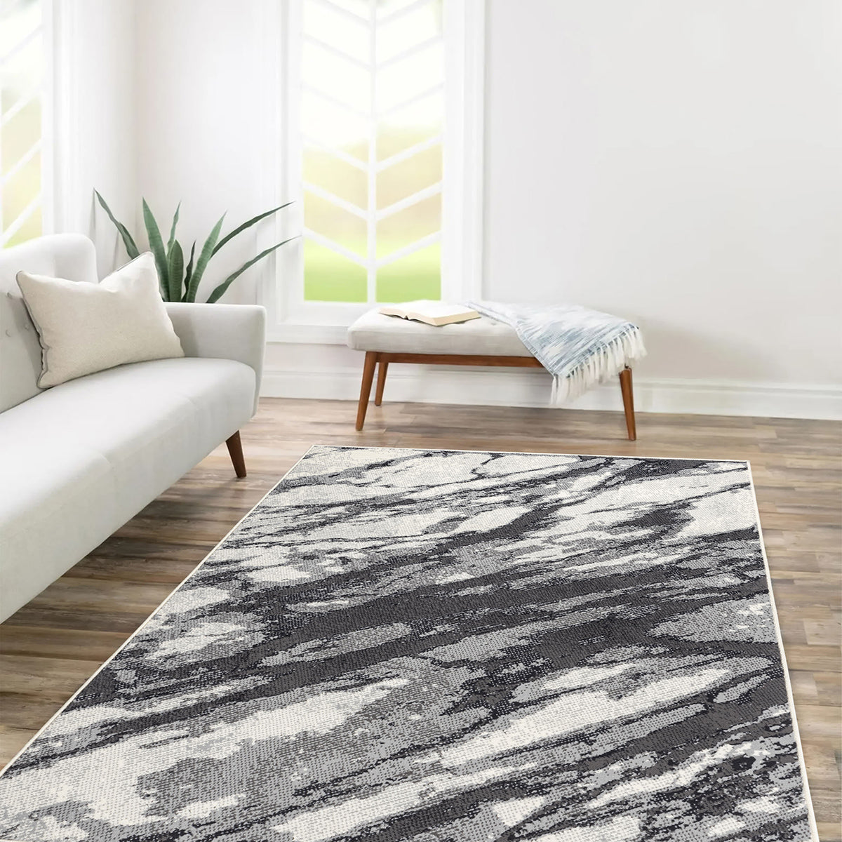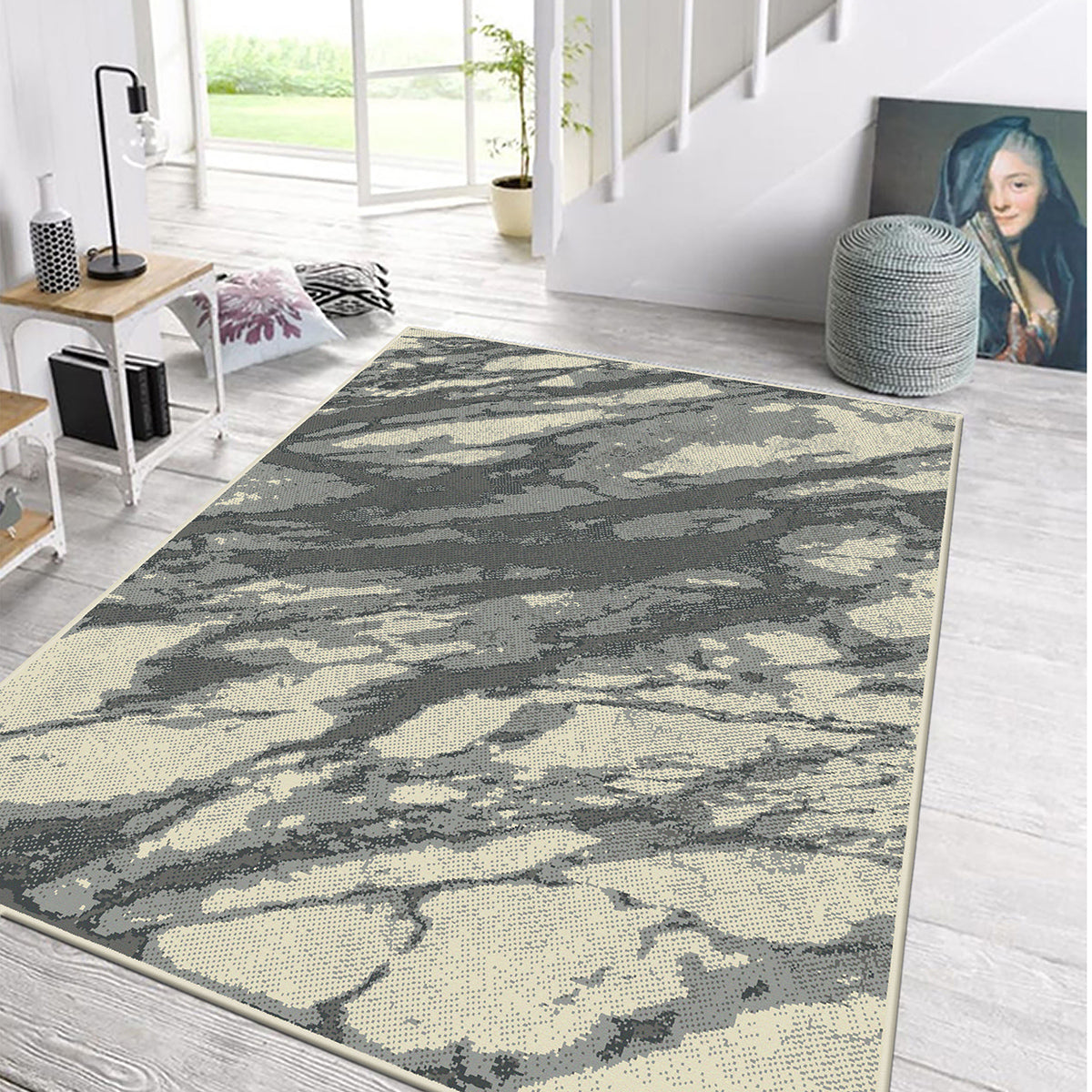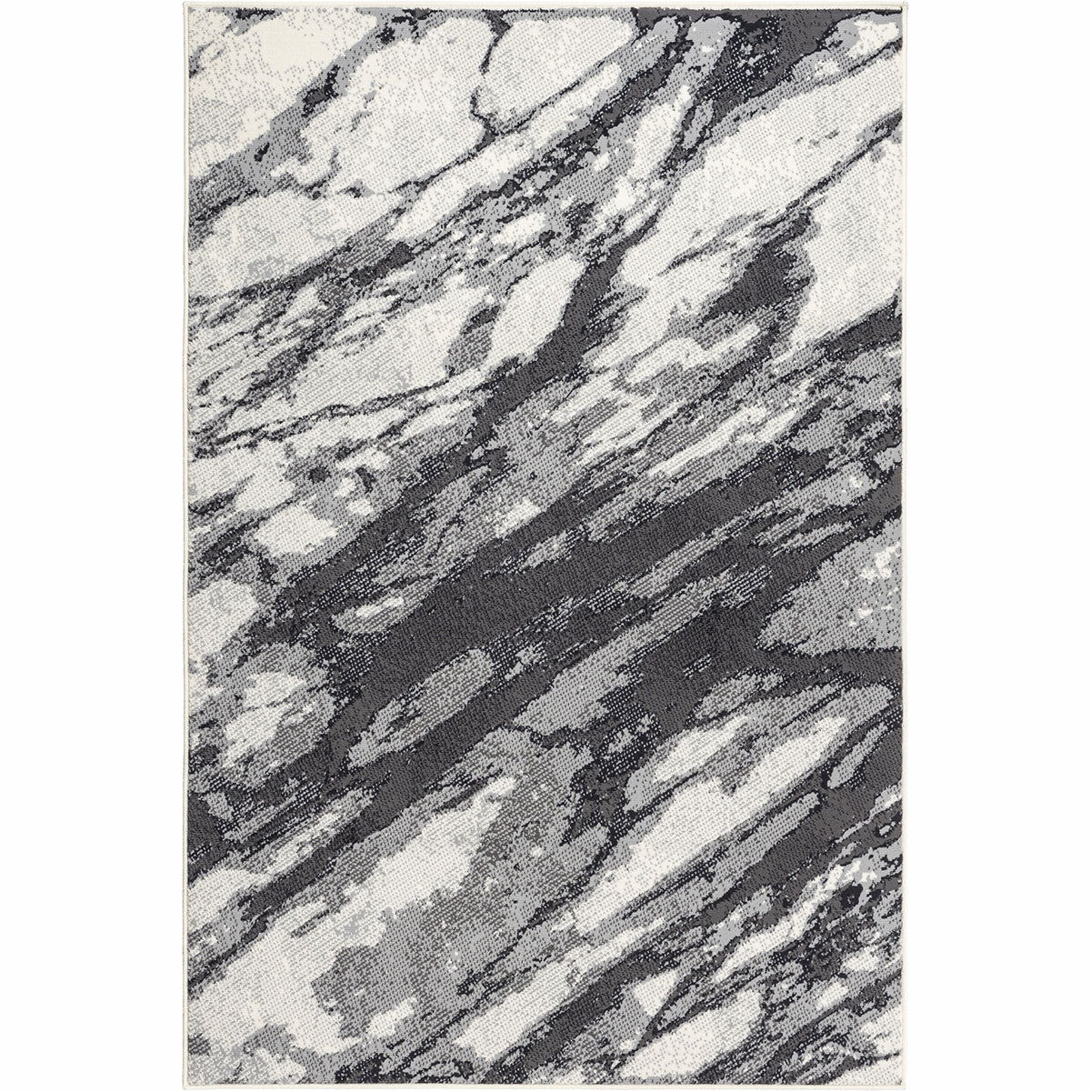 Килим в актуален абстрактен дизайн, с контрастни меланжирани цветове и форми, създаващи визуално ефект на мраморна повърхност.