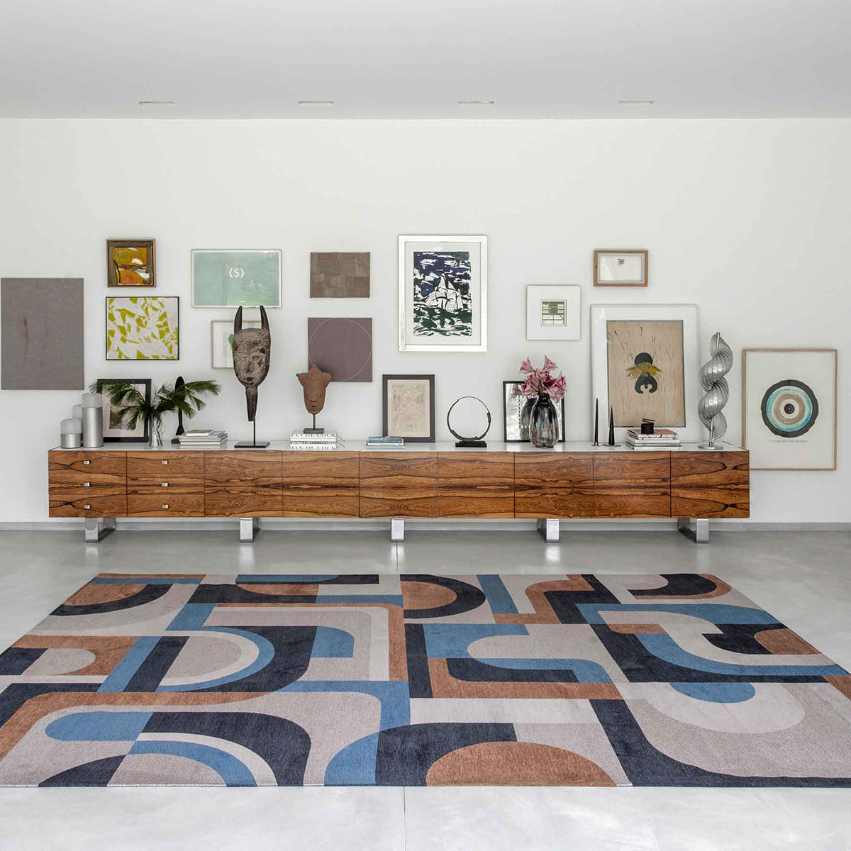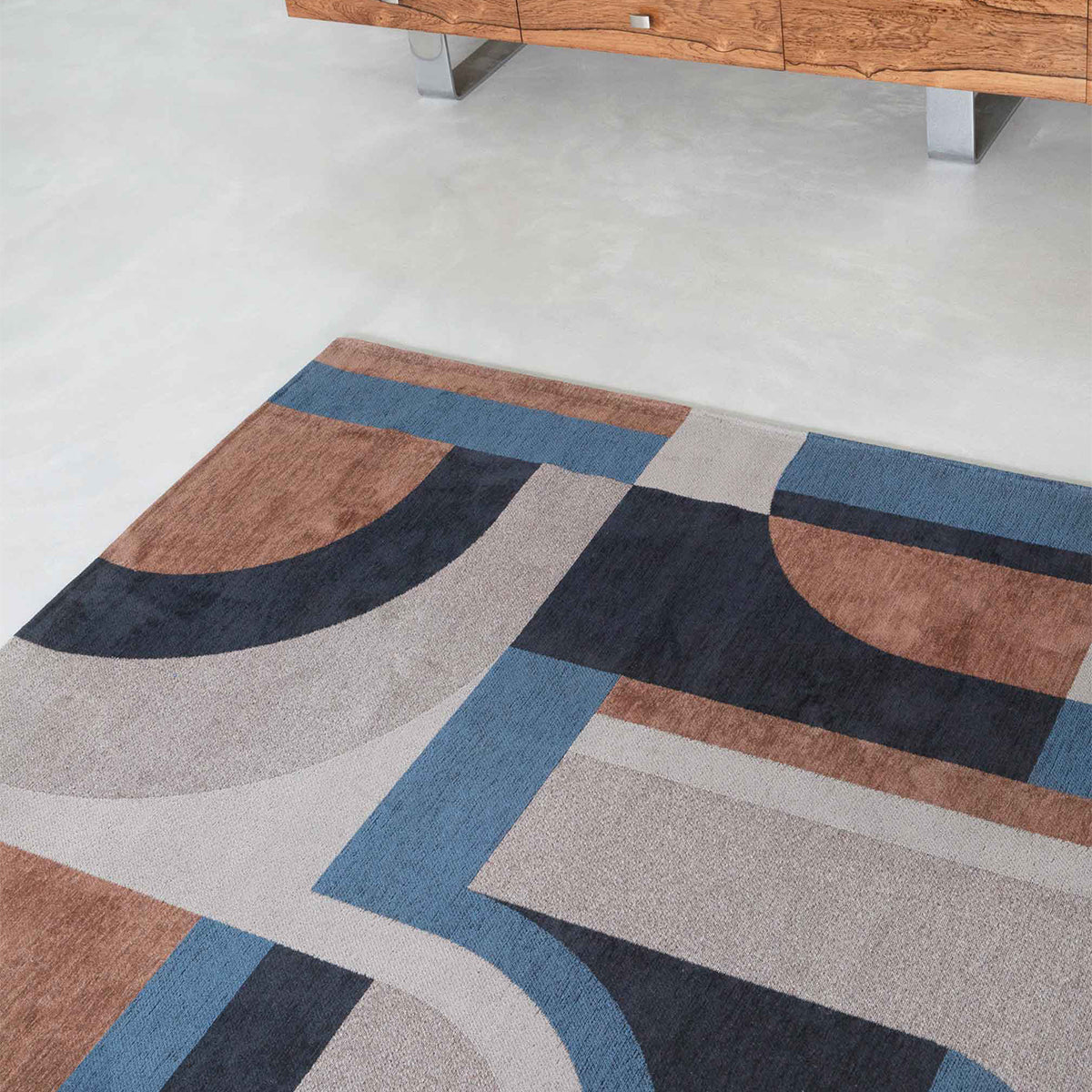 Жакардов Килим Геометричен ритъм в синьо и кафяво, вдъхновен от архитектурните, пространствени структури. В тях модулът е единица, определяща пропорциите, в симетрични и асиметрични форми, подчертани от точните цветове и топли материи.