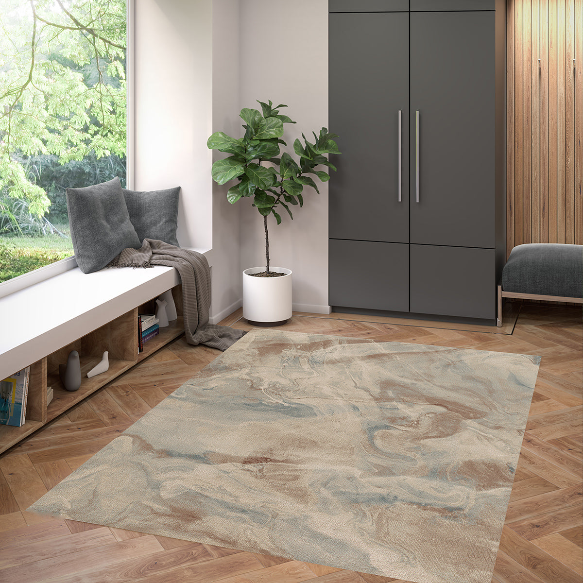 Килим с артистичен дизайн, с комфортно ниско влакно и акварелни шарки. Цветовата палитра обхваща гама от наситено бордо, керемидено червено и сиво и синьо, с основа от сиво и крем. Съчетавайки изтънченост с елегантност, този килим предлага шикозен щрих към всяко вътрешно пространство.