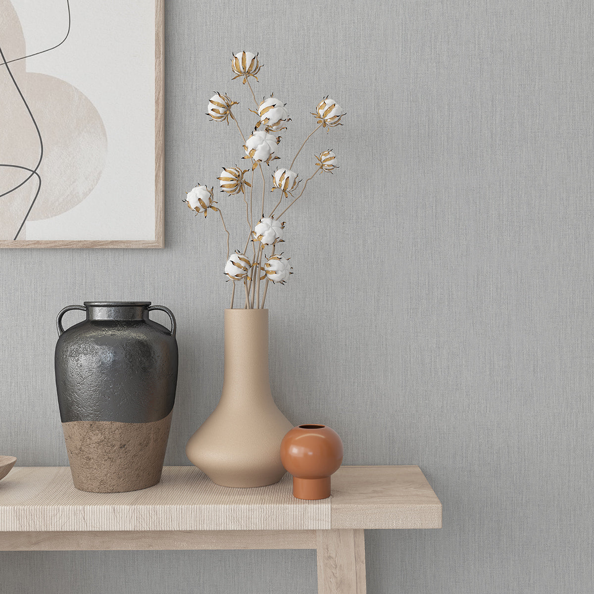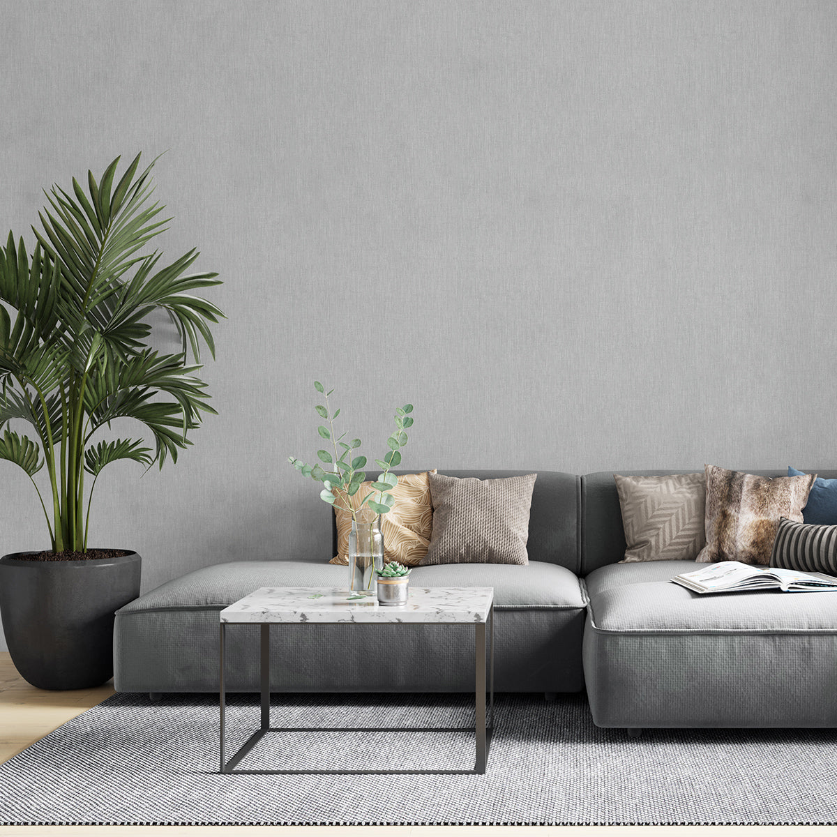 Елегантен едноцветен тапет със структура на фин ленен плат, подходящ за комбиниране с флорални и геометрични тапети от колекцията.