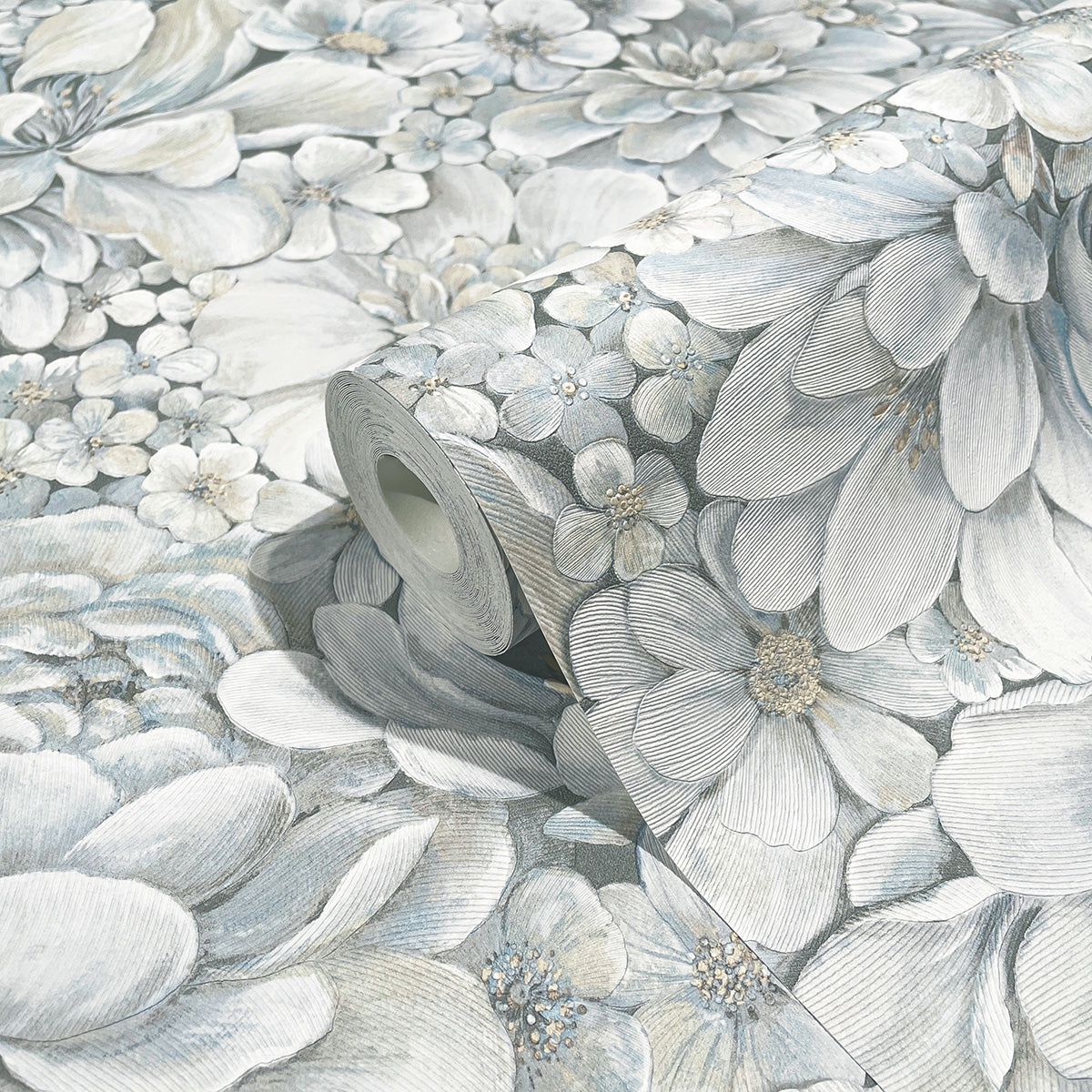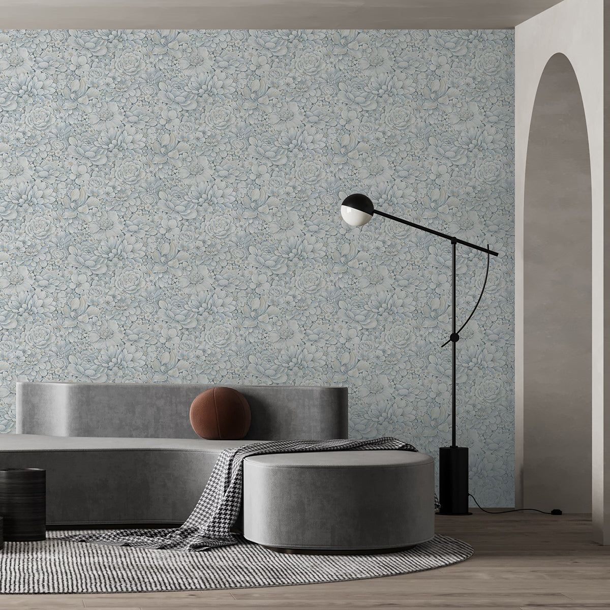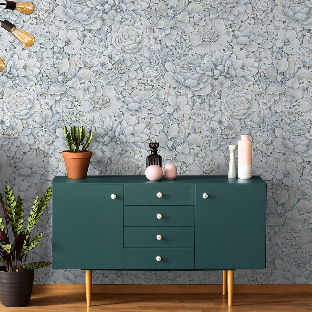 Великолепието от пищни цветове, изобразени в детайли със светлосенки и релеф върху този луксозен флорален тапет създава от стената истинско произведение на изкуството, разкошна картина, възпяваща живота.