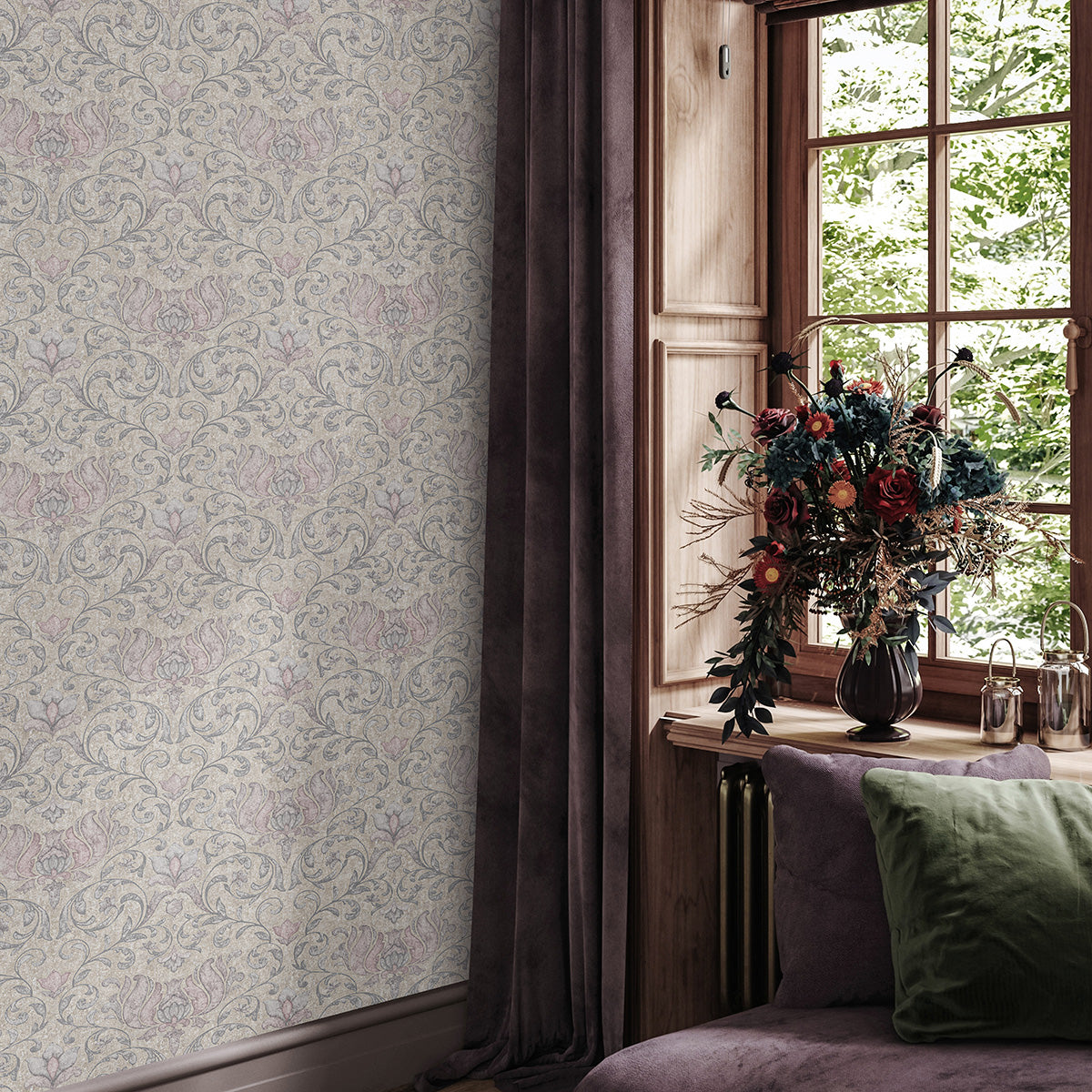 Мотив на дамаска, съставена от нежни листа и цветя. Този дизайн съчетава класическа елегантност с романтична, игрива нотка. Листата и цветята изглеждат изкусно аранжирани, почти като на стар гоблен, и придават на стаята чувствена, носталгична атмосфера, която напомня за отминали времена, пълни с блясък и романтика.