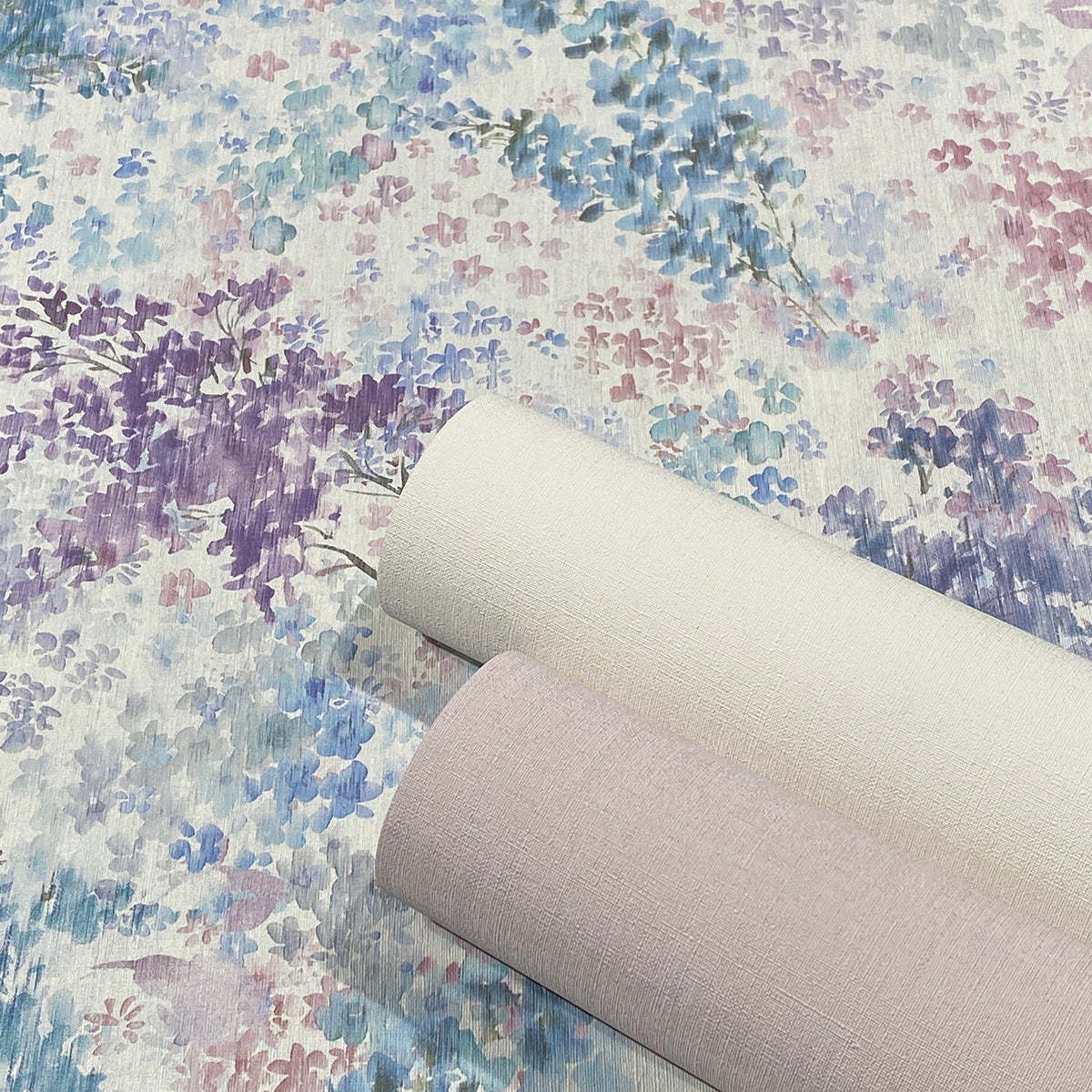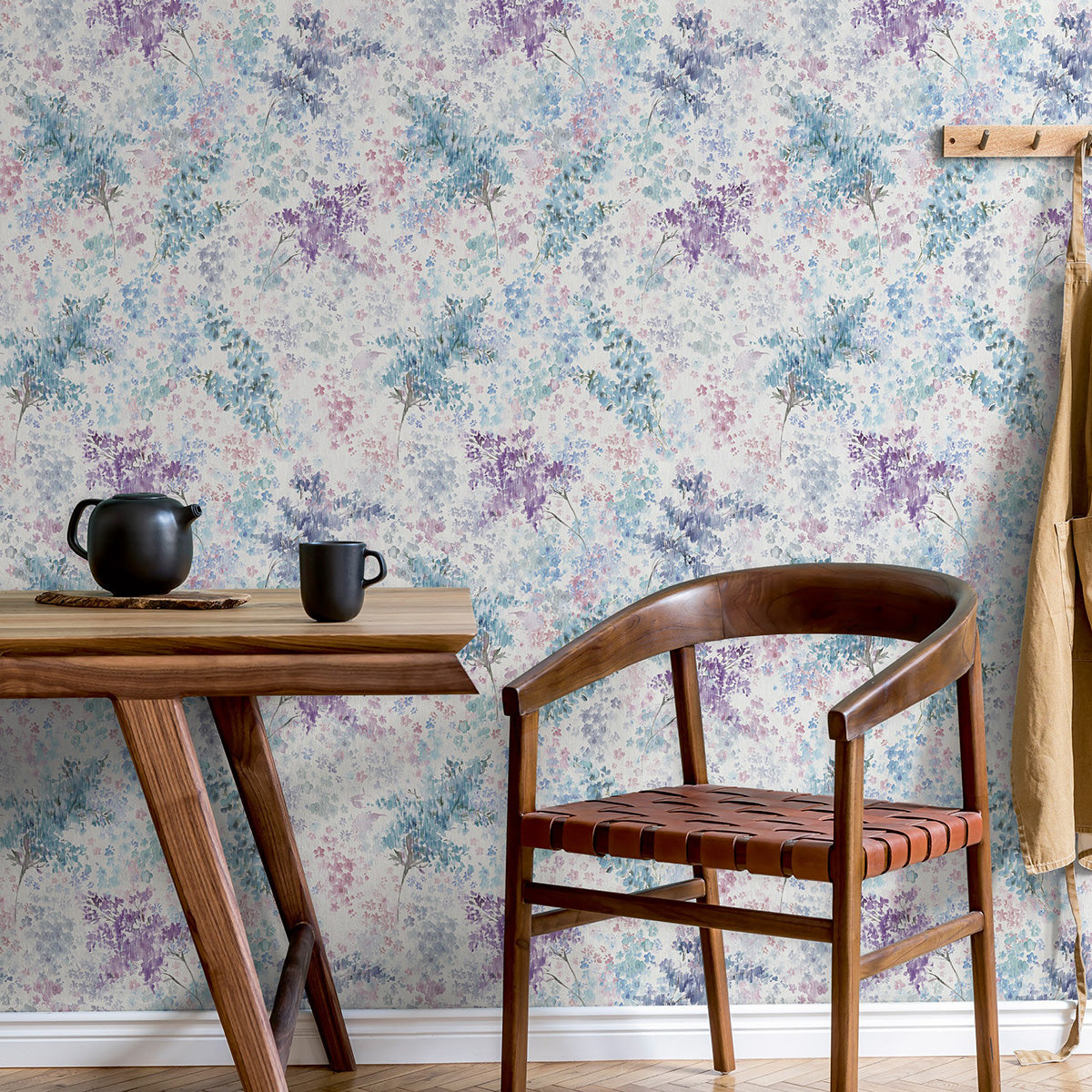 Този флорален тапет с акварелен рисунък носи настроение на релакс и почивка. Сякаш наблюдаваме разцъфтялата градина на двора през прозореца, по който се стича летния мусонен дъжд.