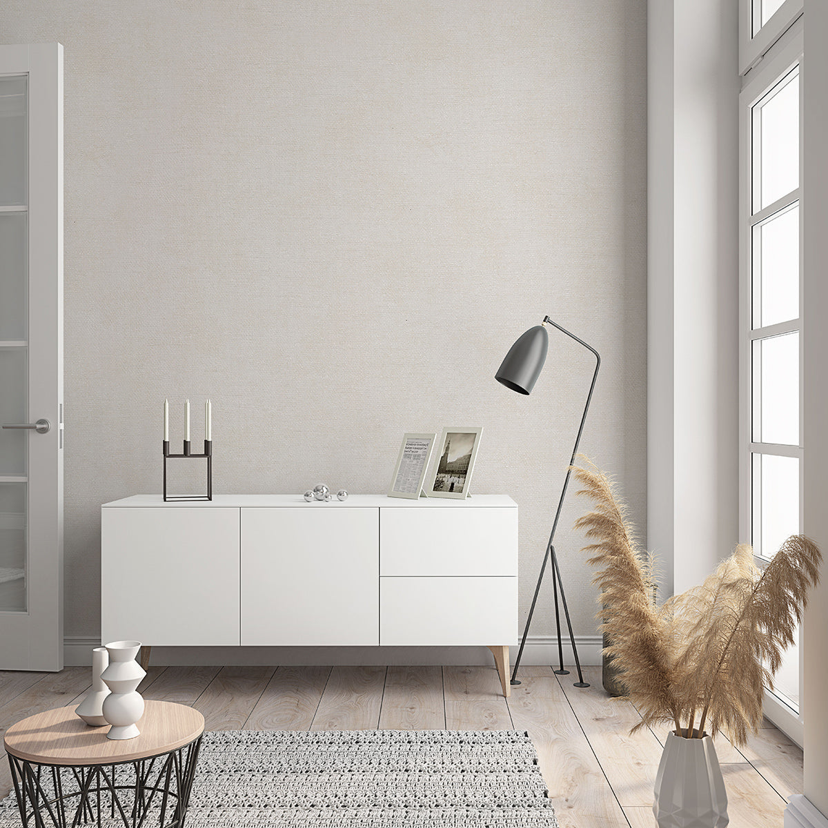 Стилен едноцветен тапет с вид и структура на фин текстил, с леки нюанси и деликатен блясък. Визията и усещането за облечена в плат стена създава чувство за уют и комфорт и носи елегантността на естествените материи. Неутралната цветова гама дава възможност за лесно съчетаване с мебели и аксесоари, както и за комбиниране с тапети с мотиви от колекцията.