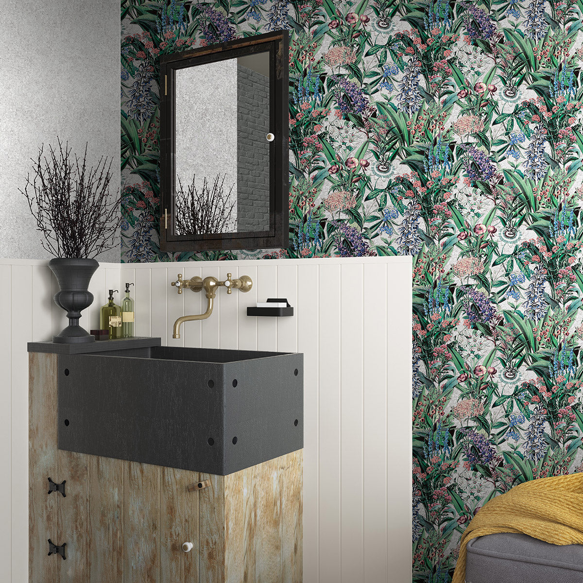 Тапет с визия на скална повърхност, в нюанси на сиво и зелено. Може да бъде поставен самостоятелно или в комбинация с тапет с мотив от колекцията.