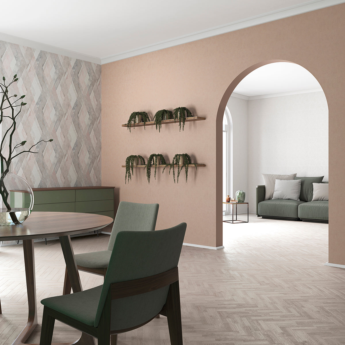 Стилен едноцветен тапет с вид и структура на фин текстил, с леки нюанси и деликатен блясък. Визията и усещането за облечена в плат стена създава чувство за уют и комфорт и носи елегантността на естествените материи. Неутралната цветова гама дава възможност за лесно съчетаване с мебели и аксесоари, както и за комбиниране с тапети с мотиви от колекцията.