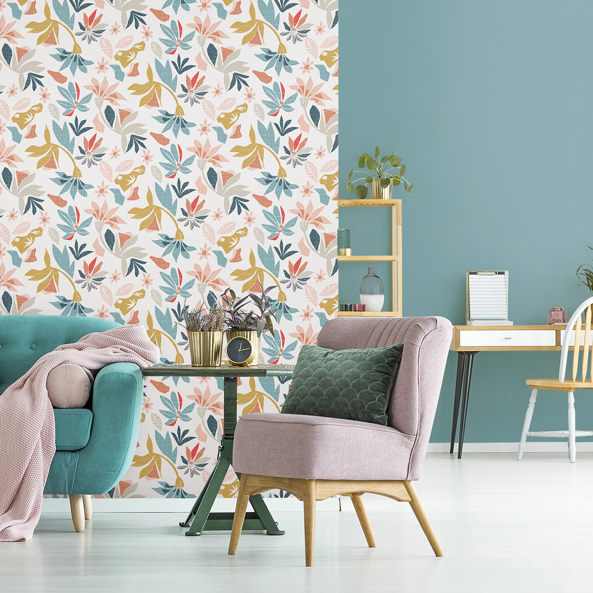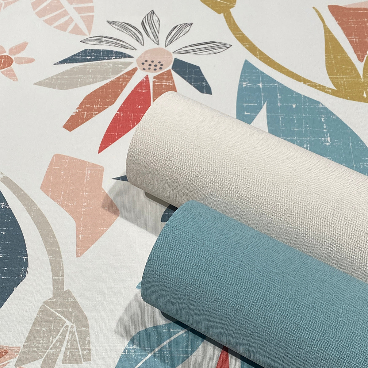 Върху този тапет колаж от стилизирани цветя осигурява лятна лекота с фина ретро нотка. Сякаш откъснати направо от графична новела, семплите силуети и матови цветове създават истинско модерно изкуство върху стената.