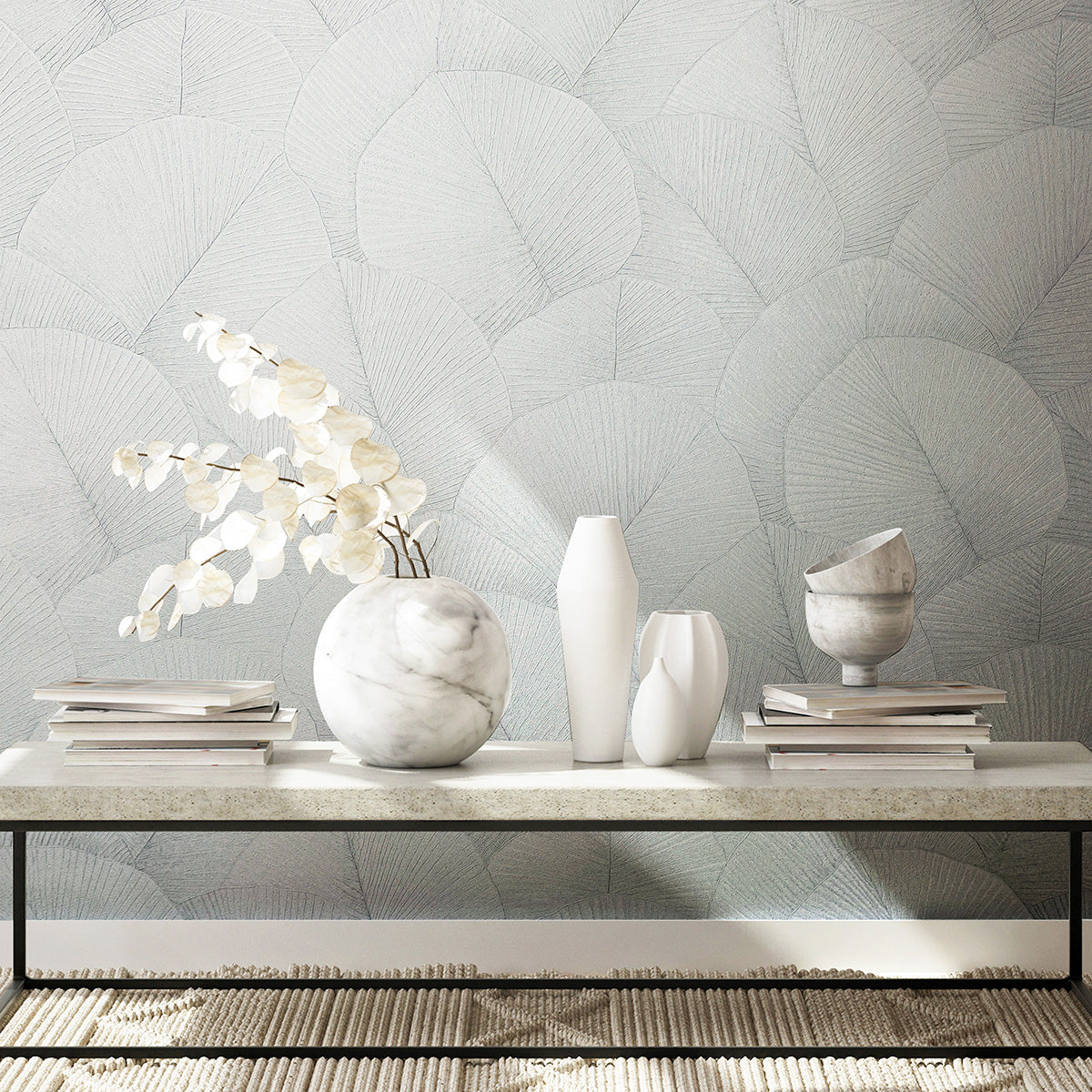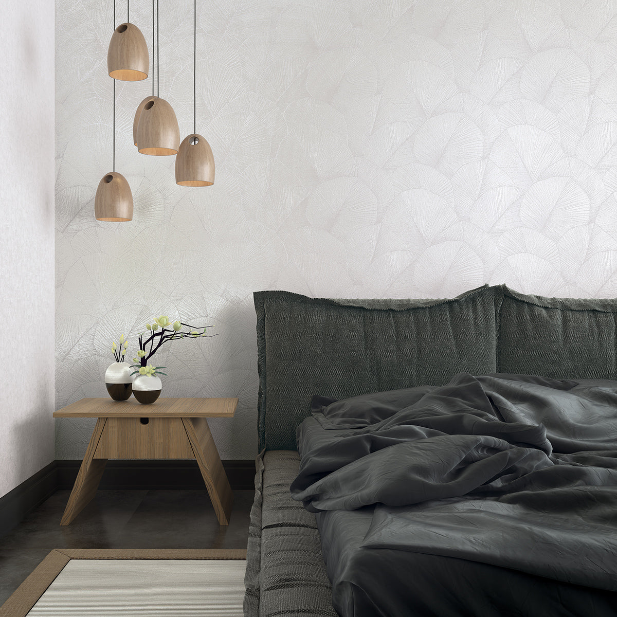 Тапет с дизайн, издържан в стилистиката на актуалния стил джапанди – комбинация от скандинавския уют на севера и изчистените линии на японското изкуство. Поставените един върху друг широки листа създават затворена повърхност, като фино отбелязаните жилки на листата и нанесените светлосенки добавят динамичен 3D ефект и дълбочина.