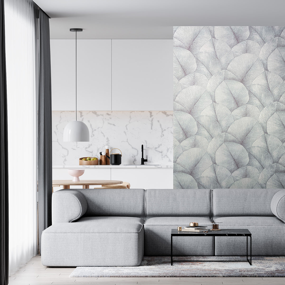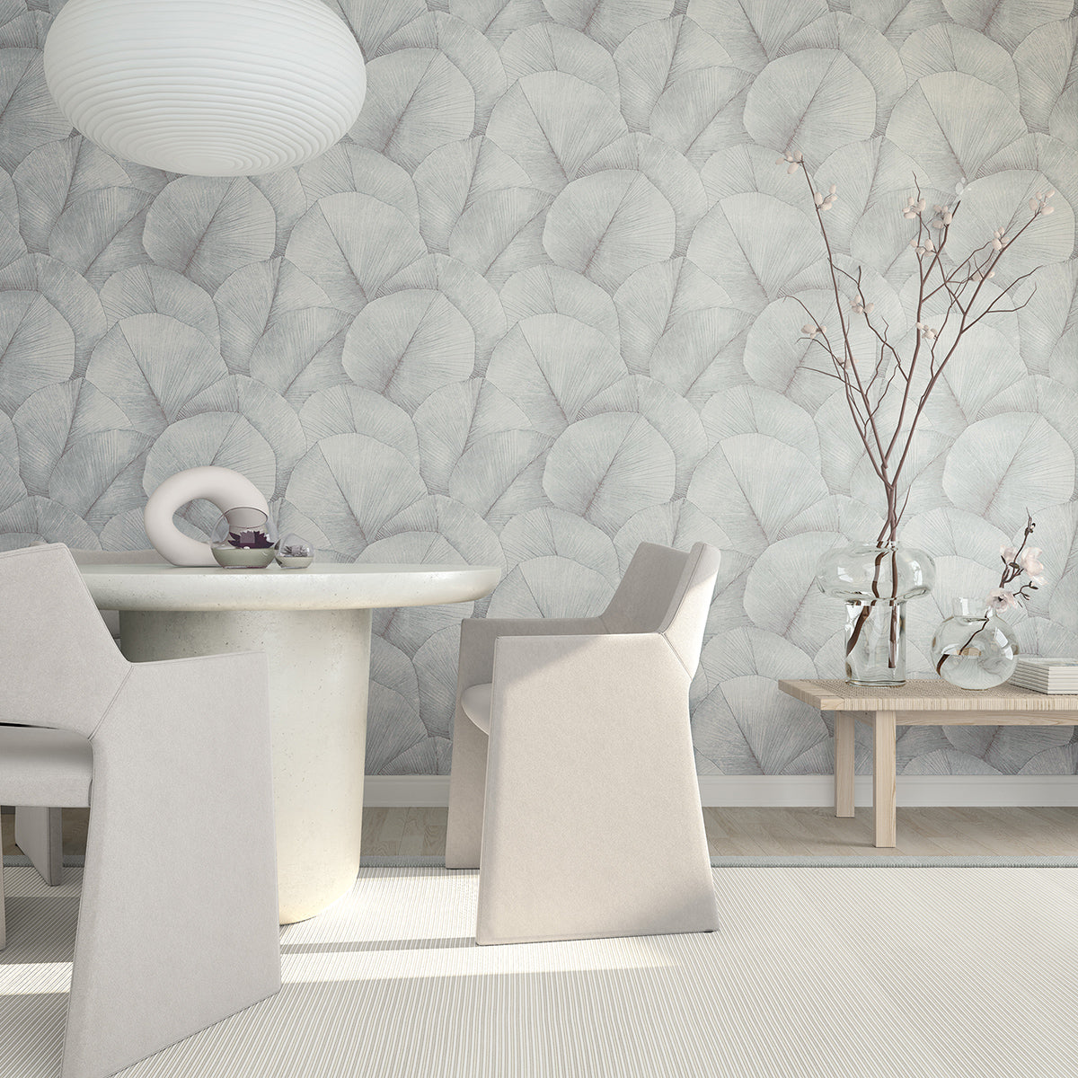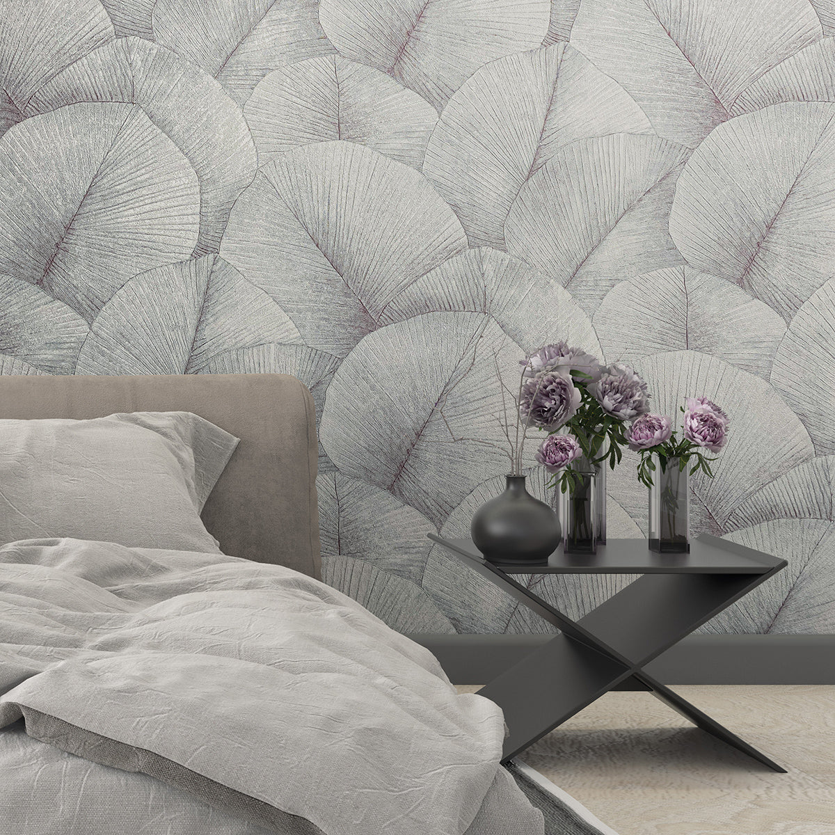 Тапет с дизайн, издържан в стилистиката на актуалния стил джапанди – комбинация от скандинавския уют на севера и изчистените линии на японското изкуство. Поставените един върху друг широки листа създават затворена повърхност, като фино отбелязаните жилки на листата и нанесените светлосенки добавят динамичен 3D ефект и дълбочина.