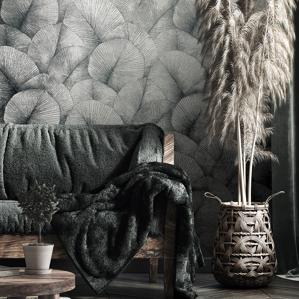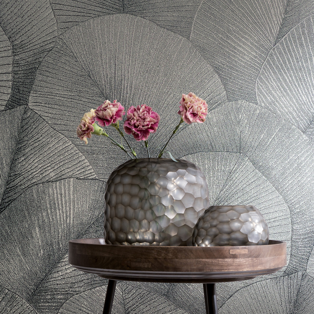 Тапет с дизайн, издържан в стилистиката на актуалния стил джапанди – комбинация от скандинавския уют на севера и изчистените линии на японското изкуство. Поставените един върху друг широки листа създават затворена повърхност, като фино отбелязаните жилки на листата и нанесените светлосенки добавят динамичен 3D ефект и дълбочина.