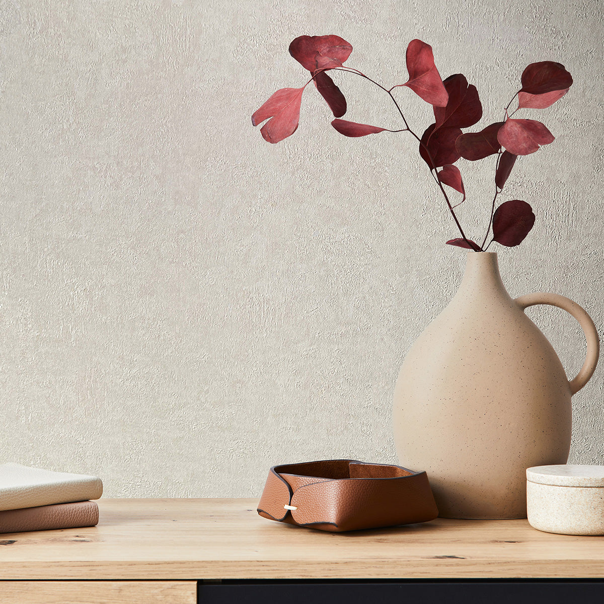 Модерен едноцветен тапет с ефекти и актуалната визия на мазилка, в елегантен нюанс, създаващ усещане за дълбочина. Може да се постави самостоятелно или да се комбинира с тапети и пана с мотив от колекцията.