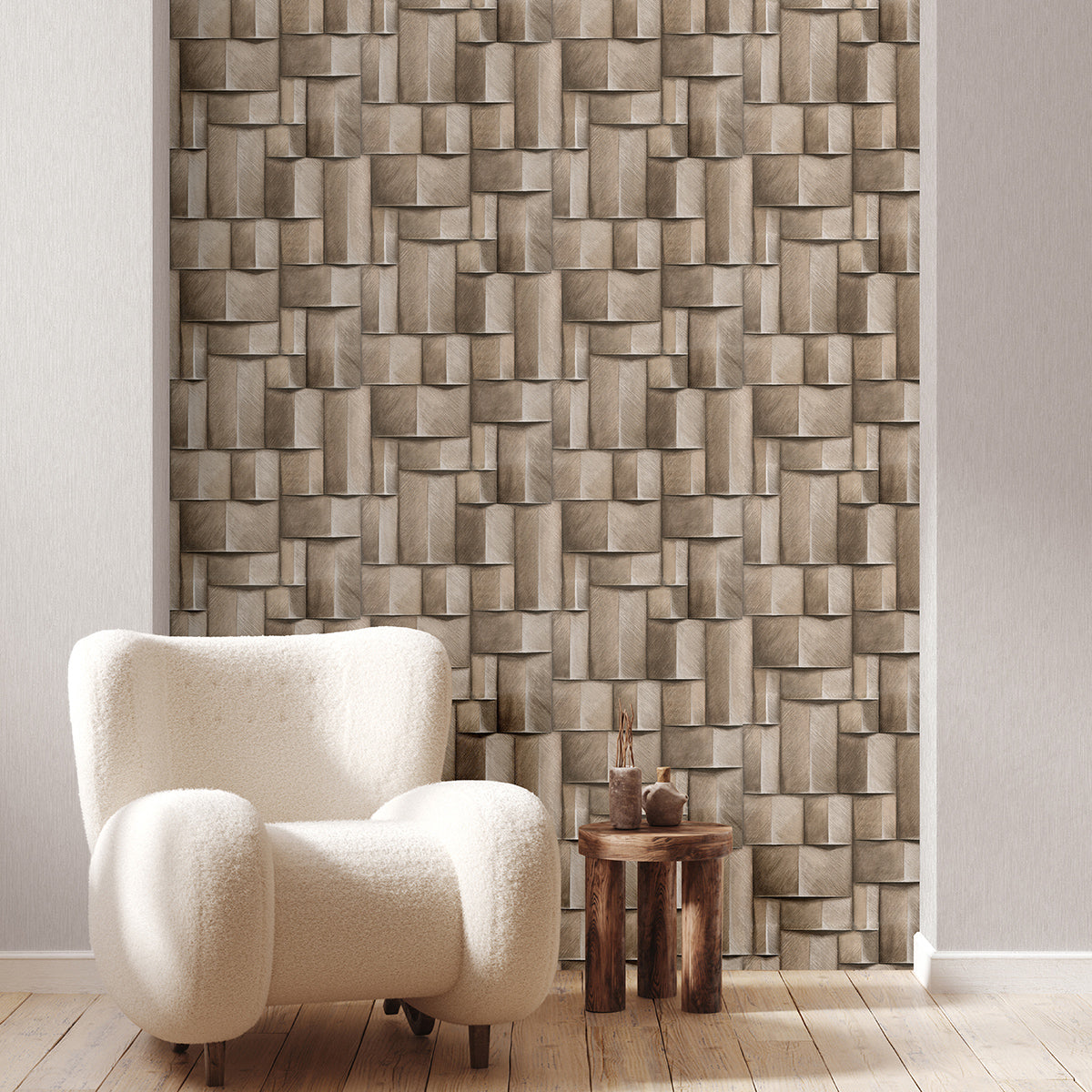 Сякаш нарисуван умело с цветни моливи, този тапет съвсем реалистично пресъздава стена от обемни дървени елементи.
