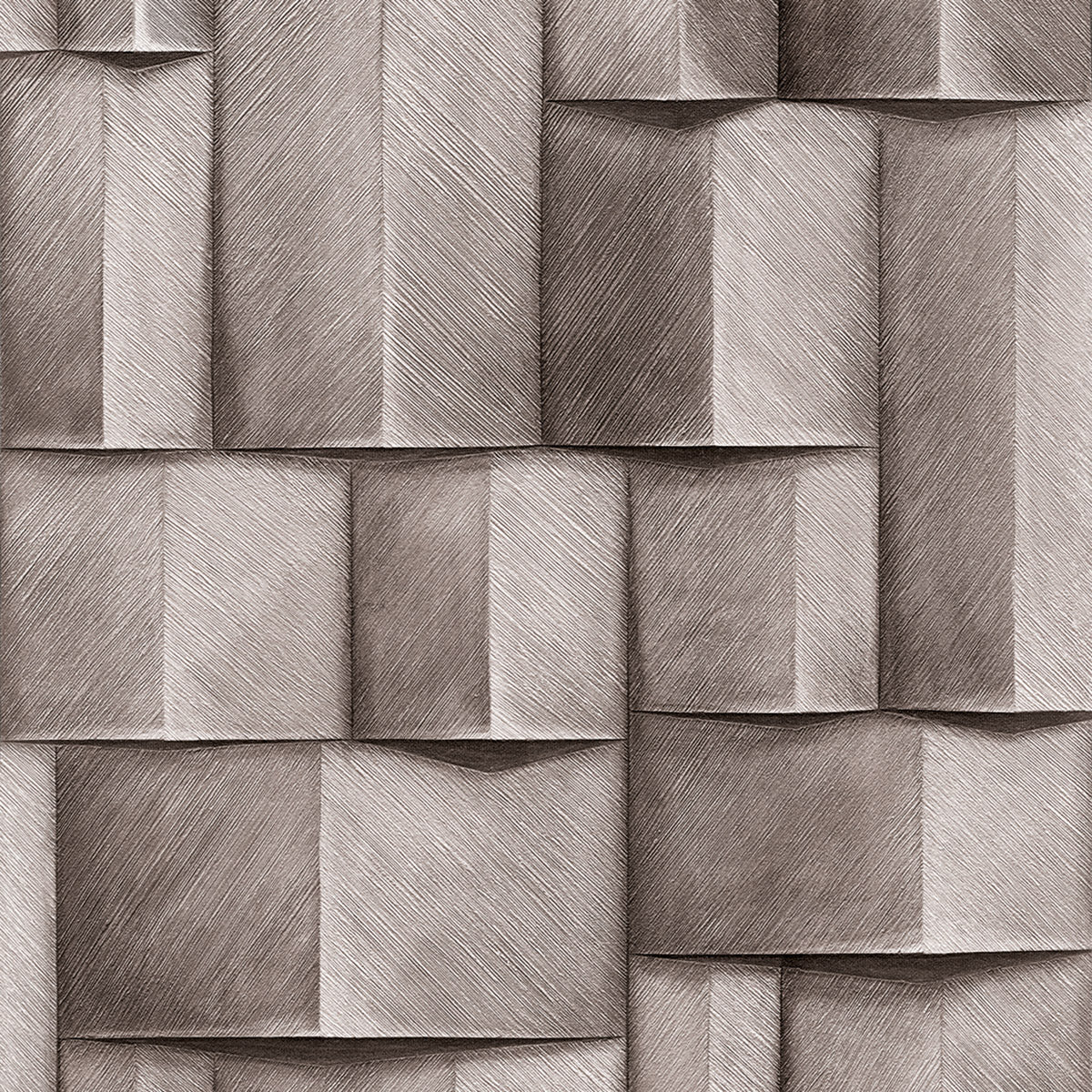 Сякаш нарисуван умело с цветни моливи, този тапет съвсем реалистично пресъздава стена от обемни дървени елементи.