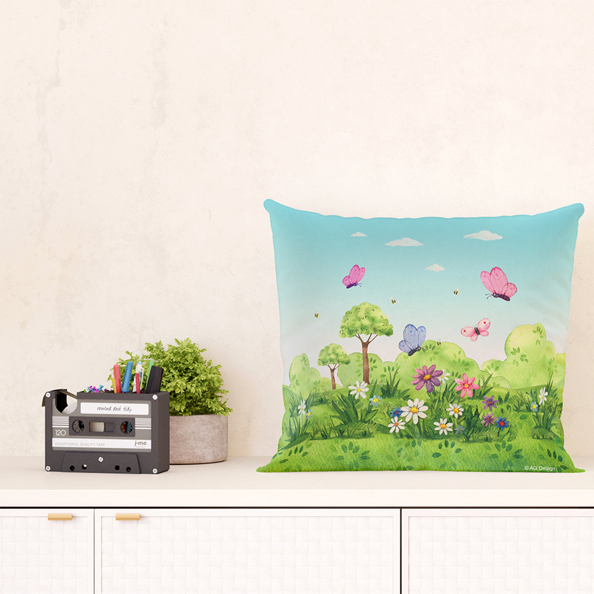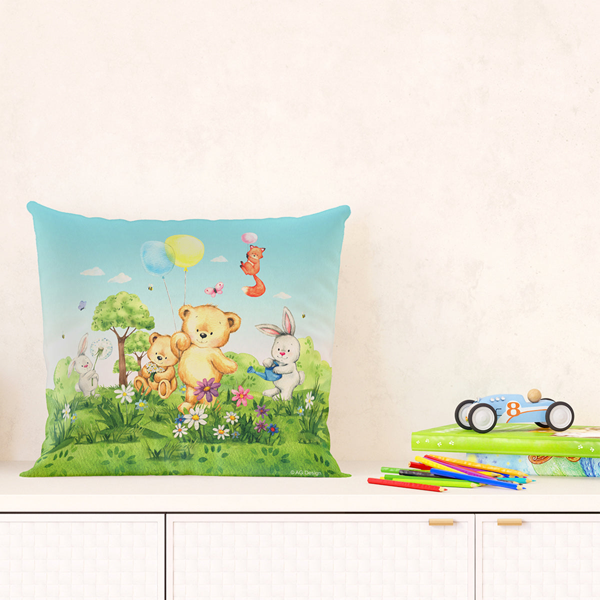 От двете страни на възглавницата са изобразени животни и растения в наситени, свежи цветове, а мекият, антиалергичен пълнеж от синтетични влакна не се степва – идеално за гушкане.