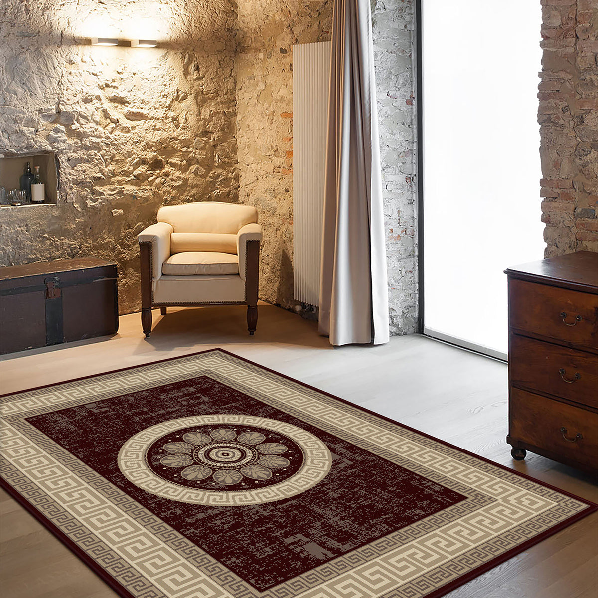 Килим с интерпретация на класически дизайн, с орнаментика тип меандър и овална централна фигура.