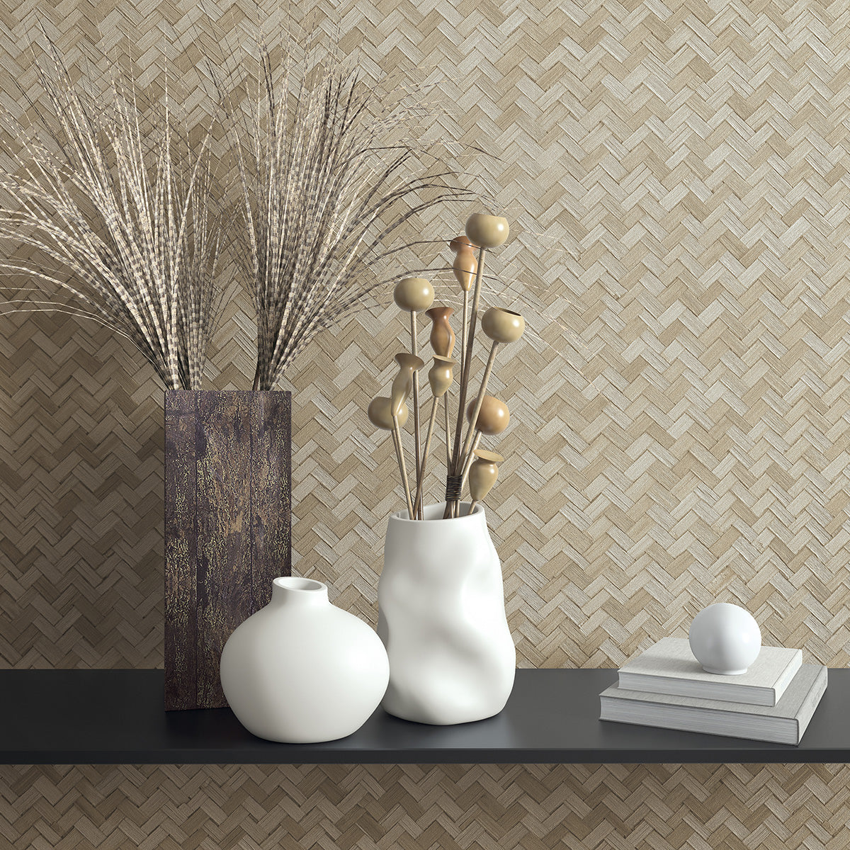 С визия на фино преплетен бамбук във формата на рибена кост този тапет с графична структура и естествени цветови нюанси перфектно допълва концепцията за заедност с природата. Натурално и семпло, земно и създаващо уют с мекотата на тоновете и структурата на естествени, растителни материи.