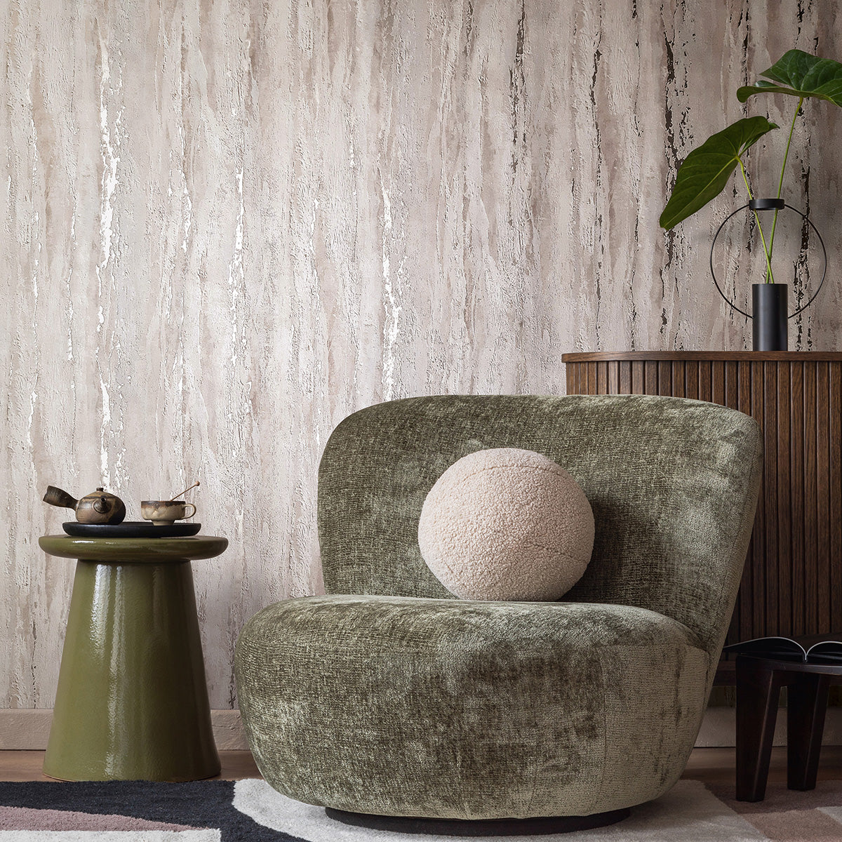 Вечната класика на мазилката като ефект на стената тук е решена от своеобразния релеф и комуникацията между гланцови и матови участъци. Това създава динамична, раздвижена структура във вертикал и усещане за пространство и височина.