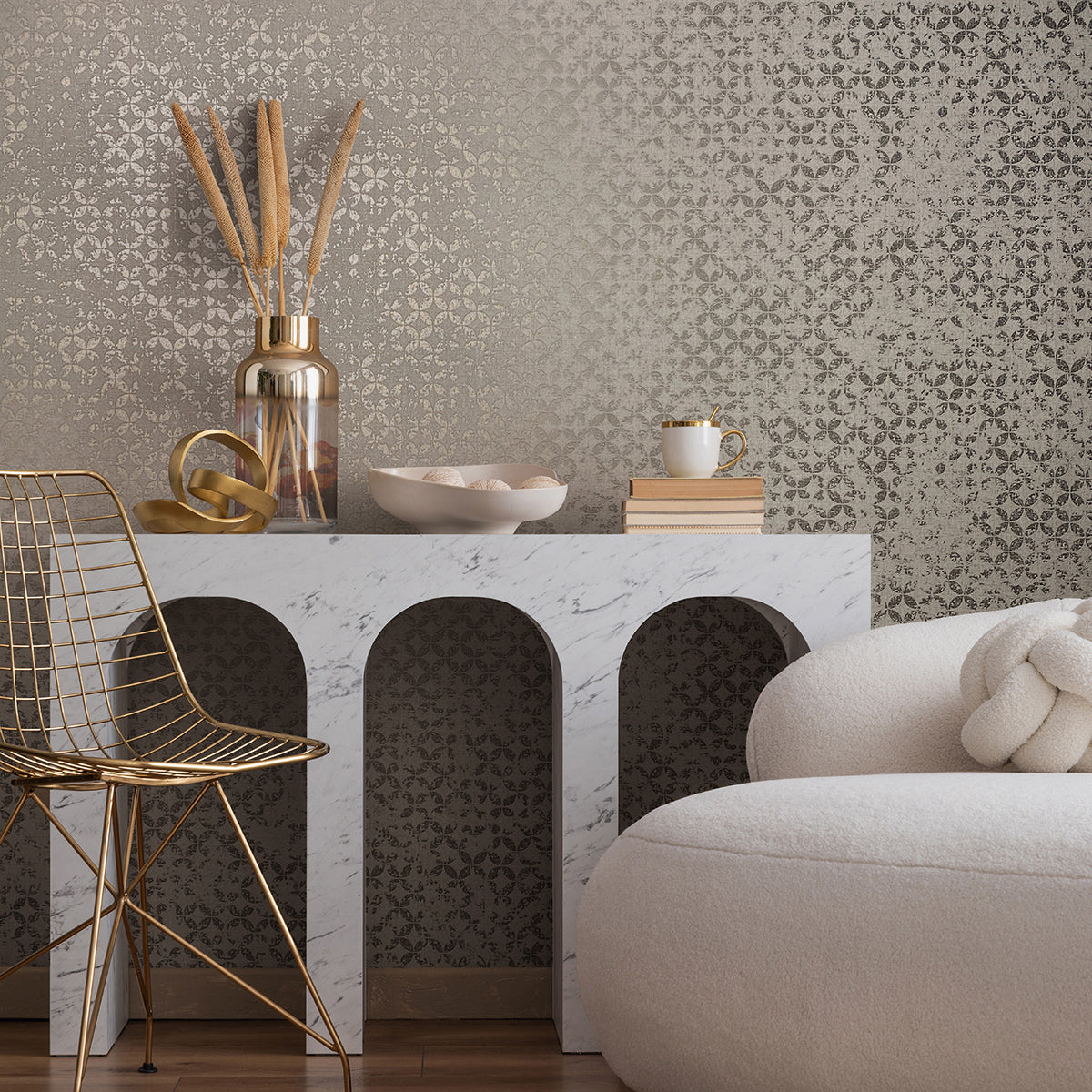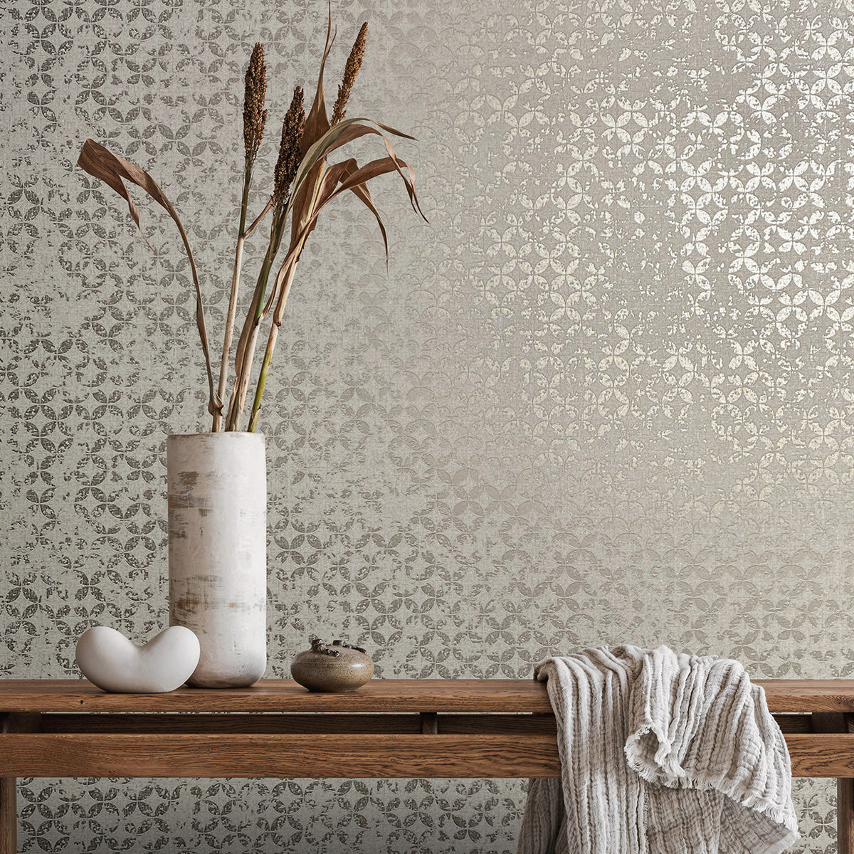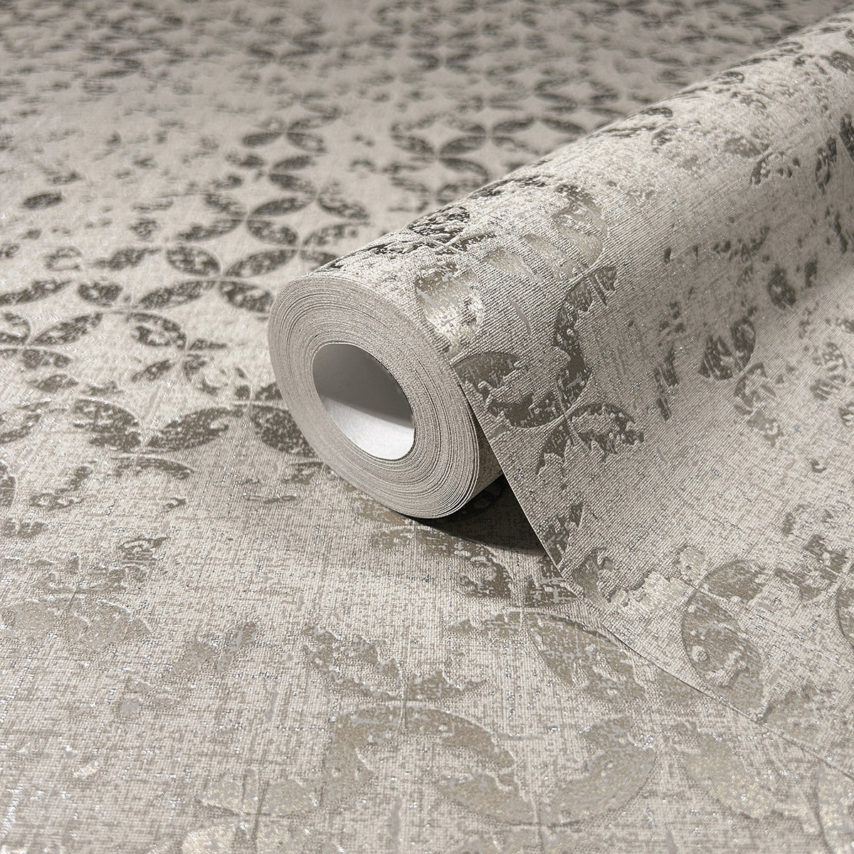 Елегантен тапет с „диамантен“ дизайн, създаден от частично застъпващи се кръгове с гланцова повърхност, върху основа със структура на текстил. На някои места „боята“ вече изглежда леко се отлепва, създавайки очарователна патина, напомняща за изветрелите стени в стари имения.
