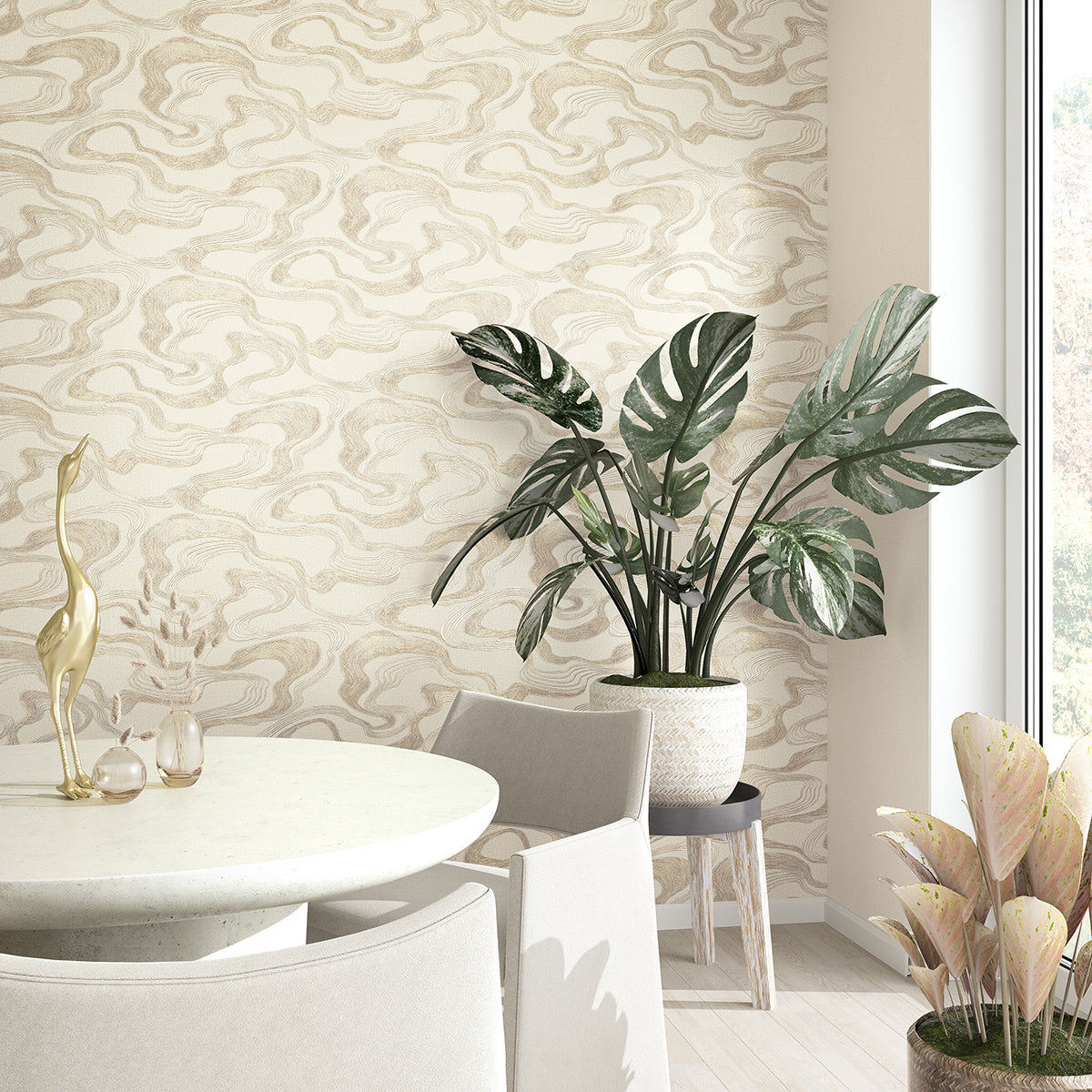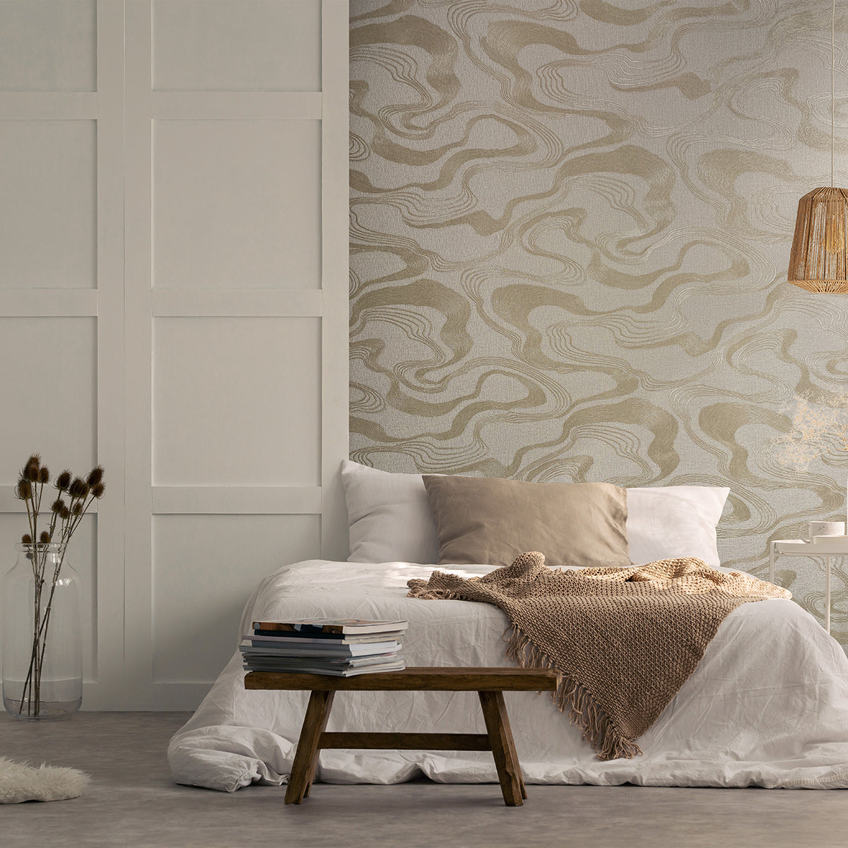Тапет с дизайн, издържан в стилистиката на актуалния стил джапанди – комбинация от скандинавския уют на севера и изчистените линии на японското изкуство. Меките извивки на тънките, гланцирани линии наподобяват мистично стелещите се мъгли в ранното планинско утро. Фонът със структура на груб текстил допълва впечатлението и има меко, естествено въздействие. Този фон се предлага в колекцията и като едноцветен тапет, подходящ за комбиниране с дизайна.