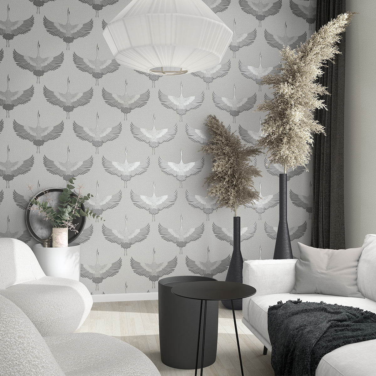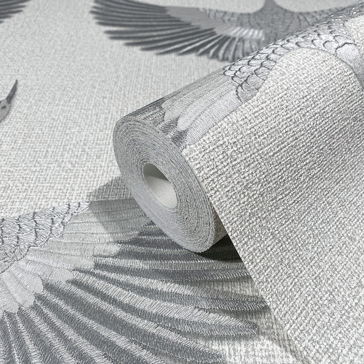 Тапет с дизайн, издържан в стилистиката на актуалния стил джапанди – комбинация от скандинавския уют на севера и изчистените линии на японското изкуство. Мотивът жерави в полет – в Япония символ на дълъг живот - е сякаш избродиран върху текстилния фон. Този фон се предлага в колекцията и като едноцветен тапет, подходящ за комбиниране с дизайна.