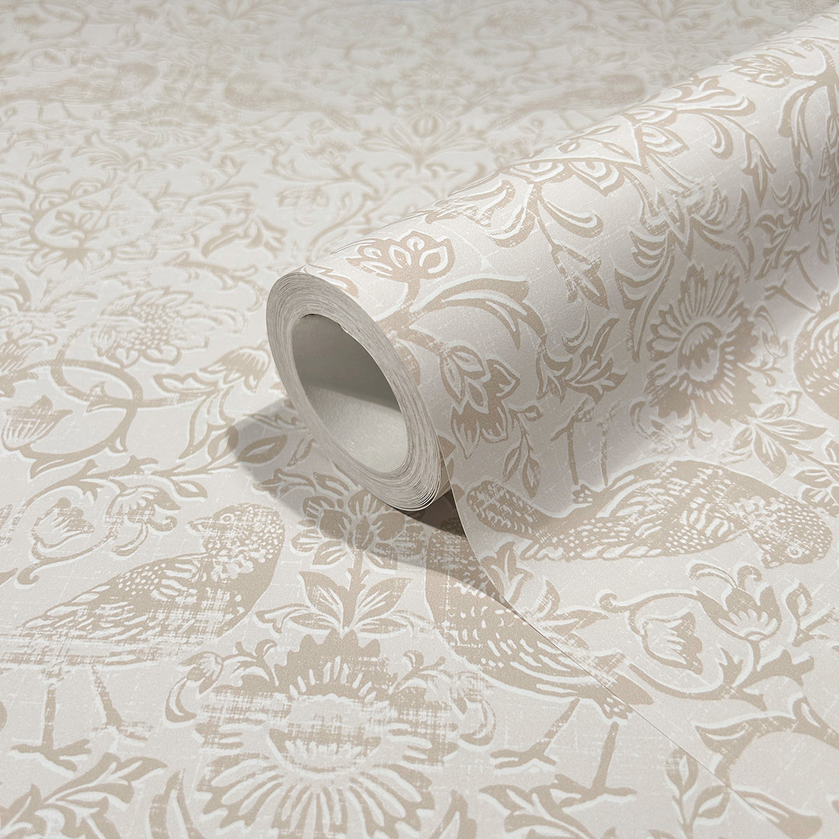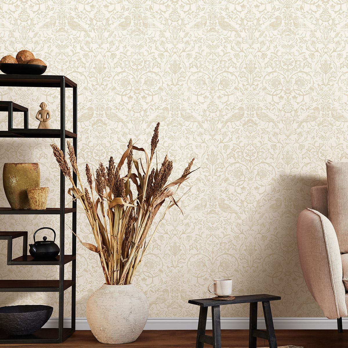 Тапет с орнаменти: стилизирани елементи от природата, подредени в приятна за окото симетрия. Поставен на стената пресъздава класиката на английски стил в обзавеждането. Дизайнът е в два цветни тона и с лек винтидж ефект, комбинира се с едноцветен тапет мрежа от колекцията.