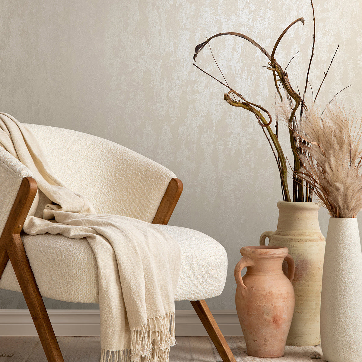 Едноцветен тапет със структура на мазилка. Елегантен цвят и фина текстура, която разпределя деликатният металически блясък в съответствие с ъгъла, под който пада светлината в помещението.