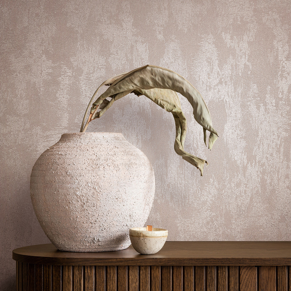 Едноцветен тапет със структура на мазилка. Елегантен цвят и фина текстура, която разпределя деликатният металически блясък в съответствие с ъгъла, под който пада светлината в помещението.