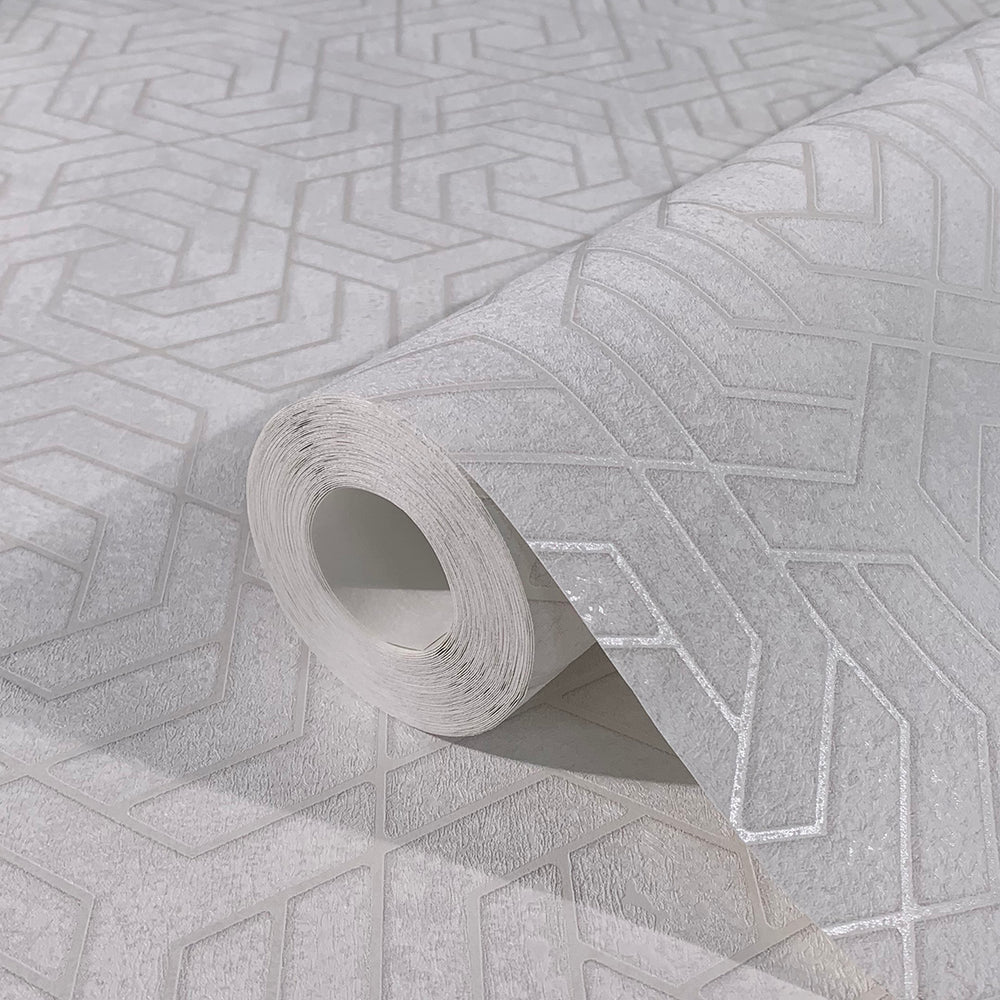 Стилна графика върху винтидж основа - с този геометричен тапет с мазилка ефект в бял и бежов цвят и силен дизайн стените излъчват спокойствие и елегантна подреденост.